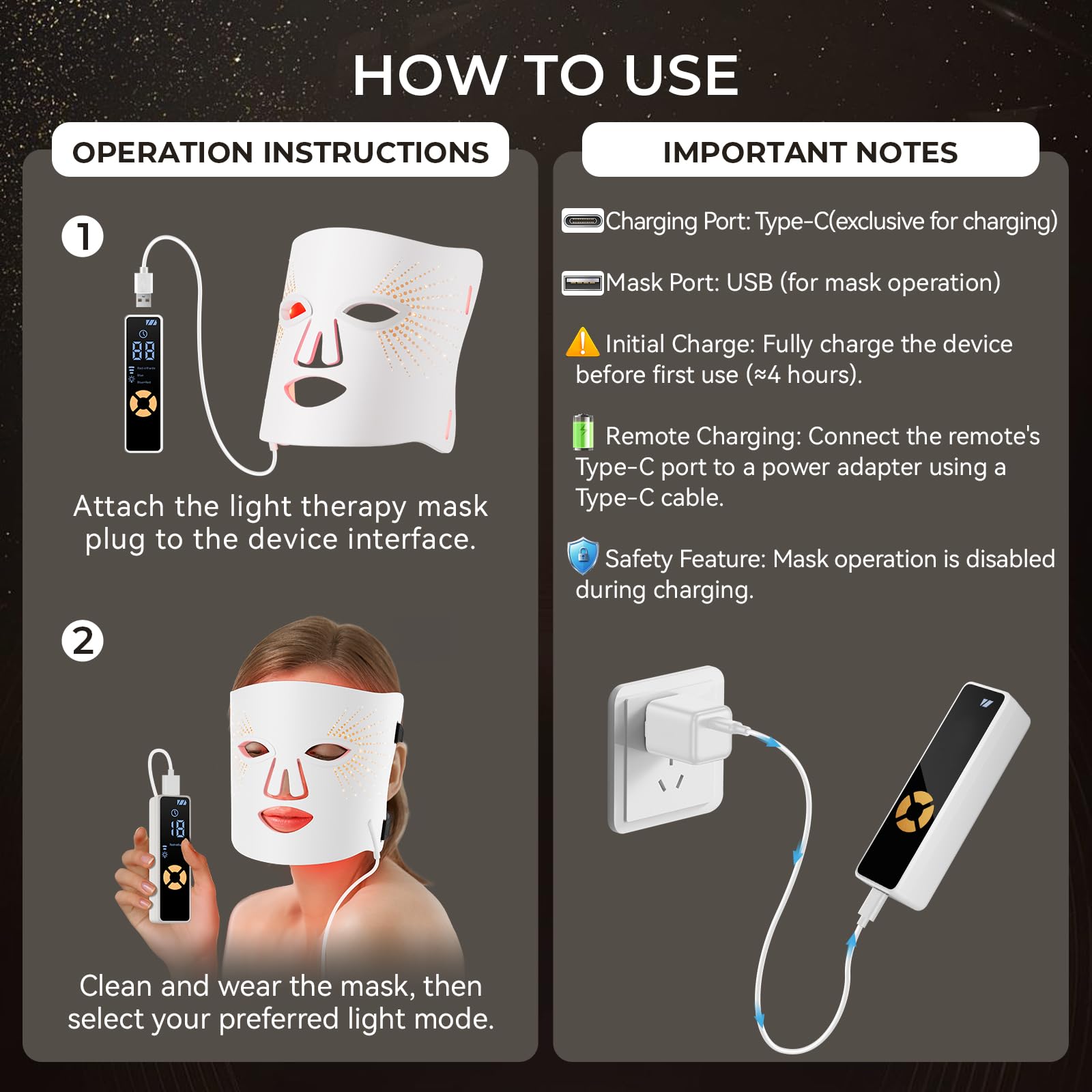 【Complete Package for Optimal Use】This led mask light therapy kit includes everything you need: 1 LED mask, 2 eye masks, 2 straps for secure fit, headband,portable storage bag,USB charging cable, a remote control with a 2500mAh battery ,1 manual,1 quick guide card and 1 treatment card for convenient operation at home. This LED face mask light therapy rejuvenates your skin and is suitable for all skin types and ages. Achieve a youthful skin, just like after a professional salon facial.