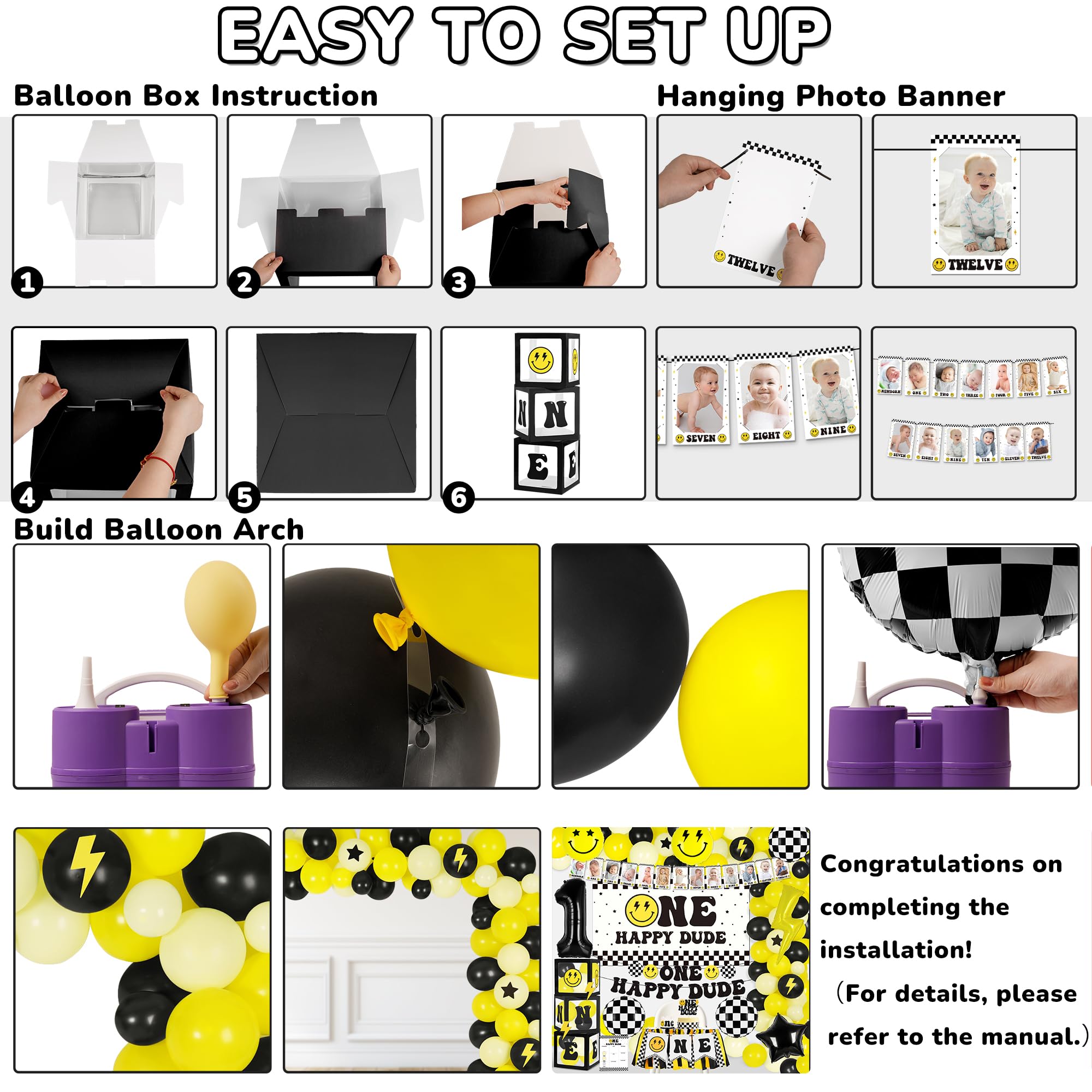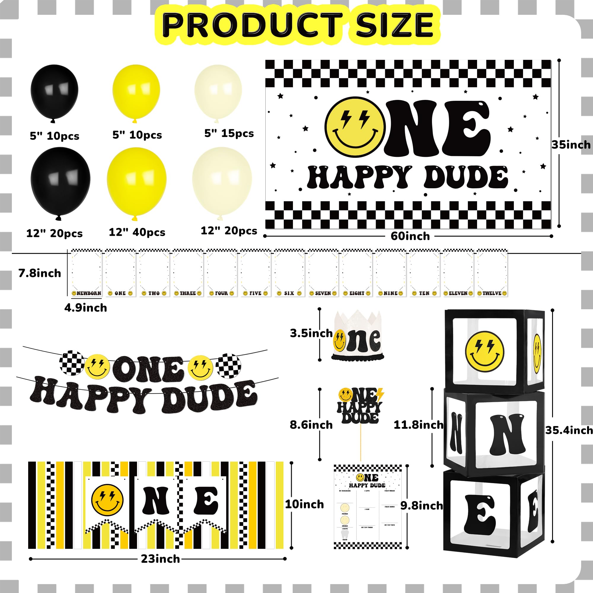 All in One 1st Birthday Party: You will get a complete set of one happy dude 1st Birthday Party Supplies, including: 3 balloon boxes (with βoneβ letters), backdrop, high chair banner, cake topper, crown, milestone poster, newborn to 12 months photo banner, one happy dude banner, 105 latex balloons (2 sizes, 5β+12β), 8 foil balloons (1 number, checkerboard, star, lightning bolt, smiley face balloons), Perfect build balloon arch kit to organize unforgettable 1st one happy dude birthday party for your baby