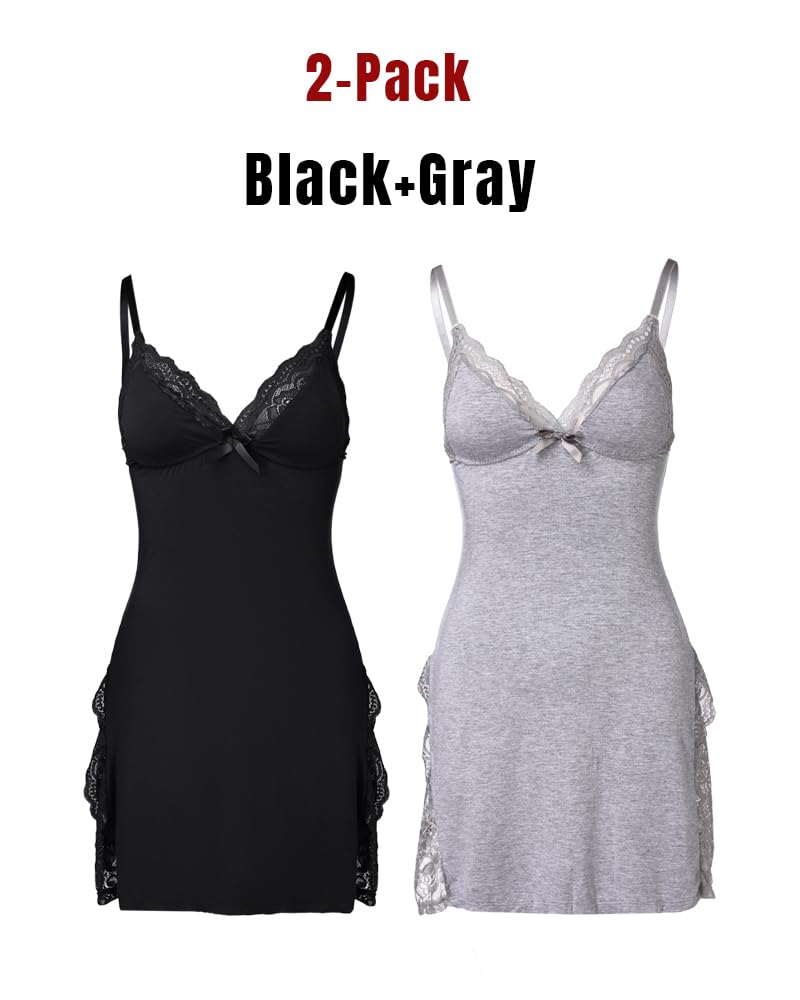 Elegant 2-Pack Babydoll Lingerie Set – This cute nightgowns for women features a low-cut neckline, delicate lace trim, and bowknot details, perfect for romantic nights, loungewear, or sleepwear