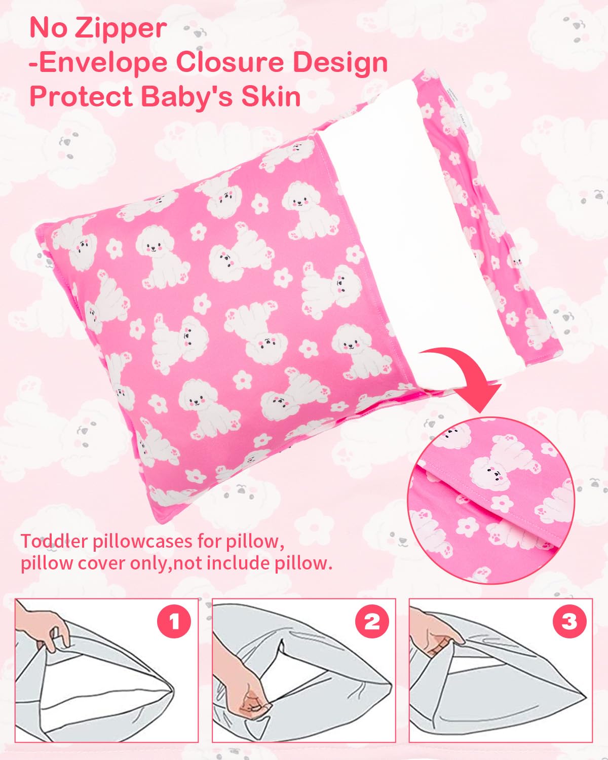 Easy to use and clean - hand washable and machine washable available.Just throw it in the washing machine when it's dirty.Gets softer with each wash.Toddler pillow covers have 2 pcs replacement baby pillowcases will keep the pillow clean and comfy.