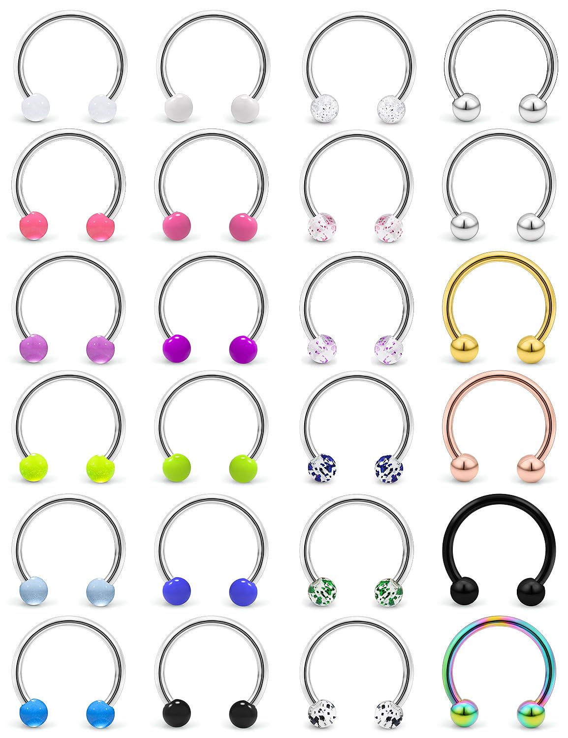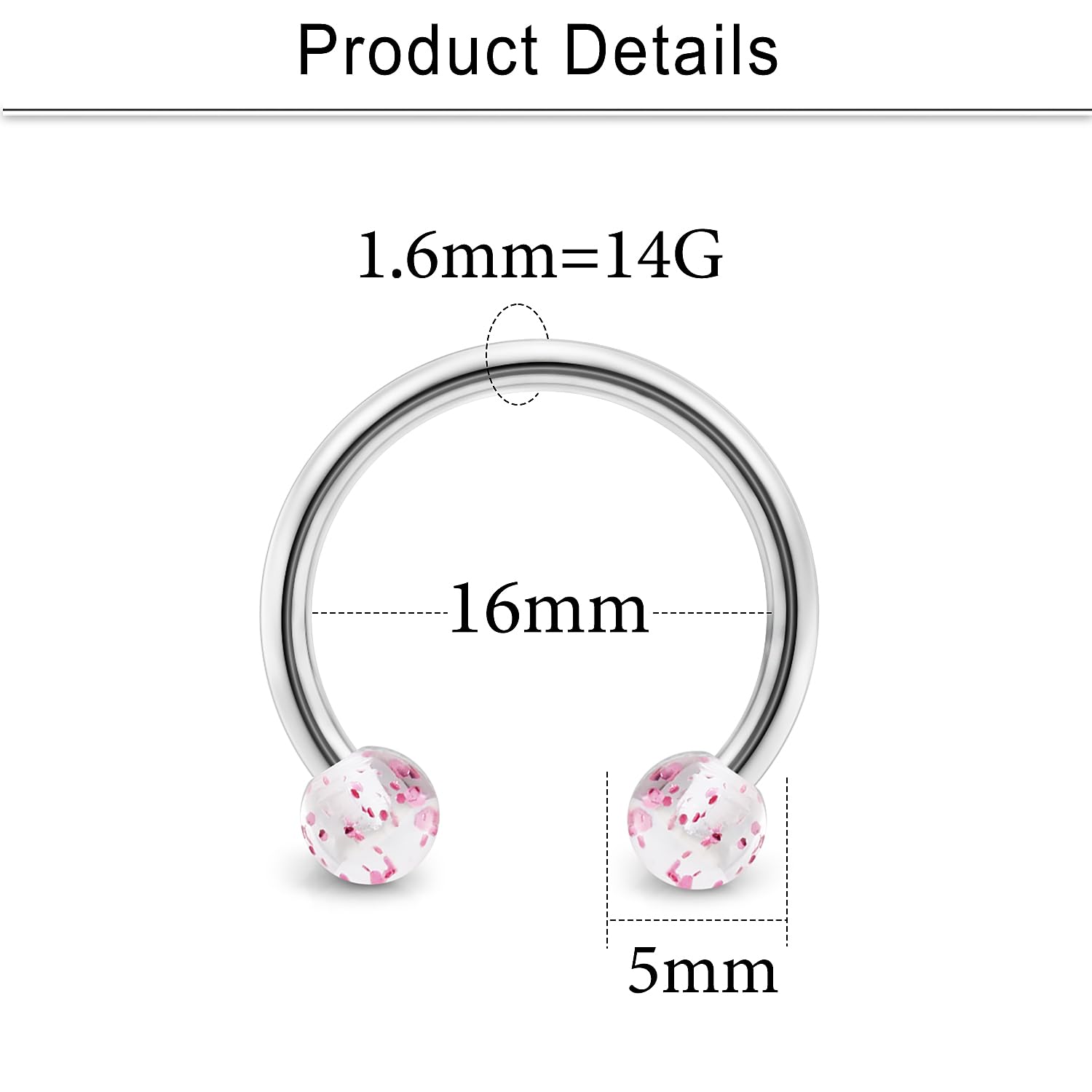 THICKNESS: Gauge Size: 14G (1.6mm); Inner Diameter of Horseshoe Barbell: 16mm (5/8");Balls Size:5mm, Color: Silver-tone, Black, Blue, Rose Gold, Rainbow, Gold-tone.