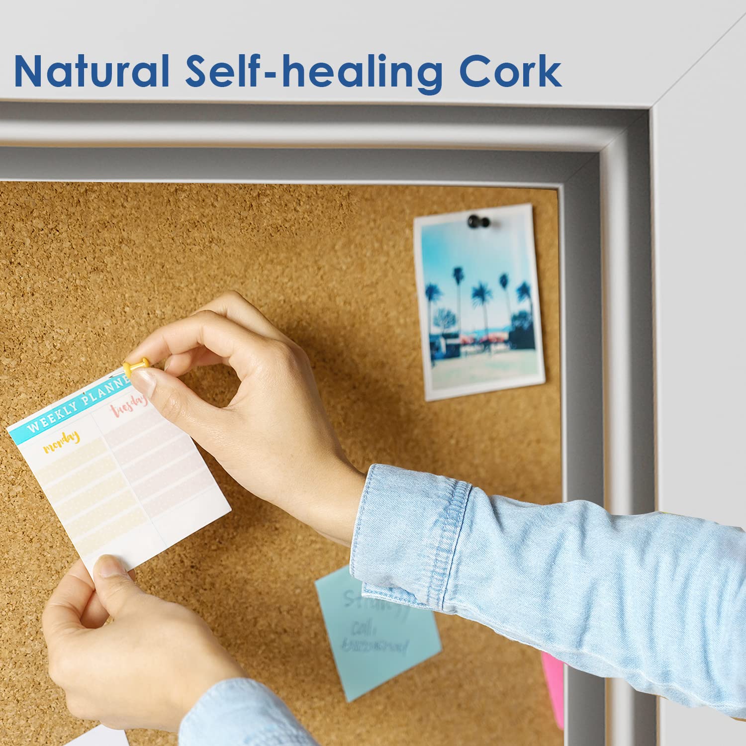 DURABLE & SELF-HEALING CORK—Environment friendly natural cork surface is fully secure items with push pins, and the features of the cork can make holes re-close when push pins are removed, which helps extend the life of your board.