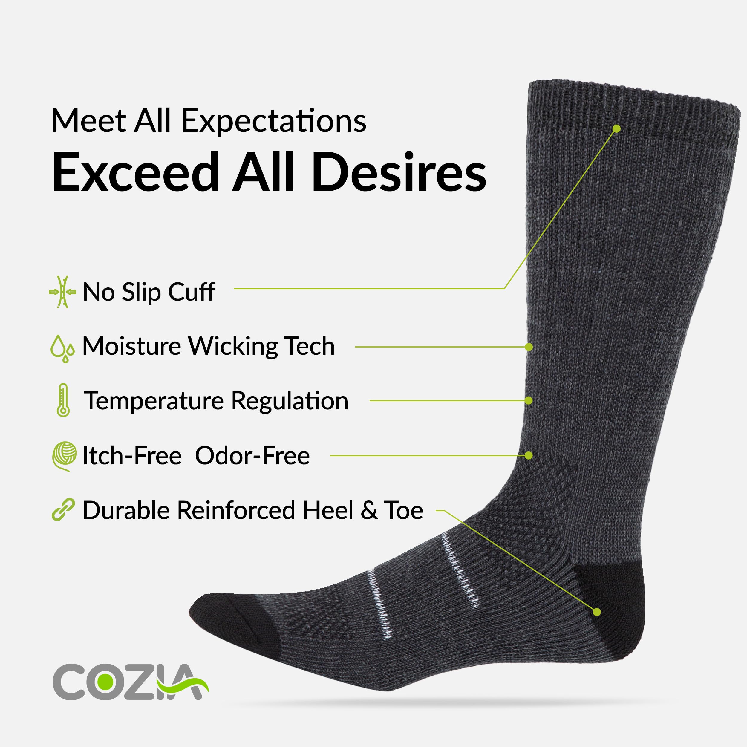 WINTER SOCKS FOR FREEZING FEET – Keep your feet from freezing, protect them from the biting cold winter chill, and enjoy superior comfort with Cozia Thermal Socks for men and women. Our wool socks (mens) have a soft brushed fuzzy inner that provides you with a comfortable fit, gives enhanced cushioning which makes you feel like stepping on a cloud, and helps always keep your feet protected from adverse weather conditions.
