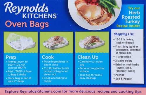 Make moist, delicious holiday meals with Reynolds Kitchens Turkey Size Oven Bags, and save time on cleanup. Enjoy great-tasting, flavorful turkey and skip the time you'd spend soaking and scrubbing your pan. These disposable roasting bags help seal in the natural juices of turkeys up to 24 pounds while cooking, to keep each and every cut tender and delicious. These turkey bags can do it all; each bag is BPA-free, oven-safe up to 400 degrees and can even be used as a brine bag. Spend more time with your loved ones and less time on turkey cleanup this holiday season with Reynolds Kitchens Turkey Size Oven Bags.