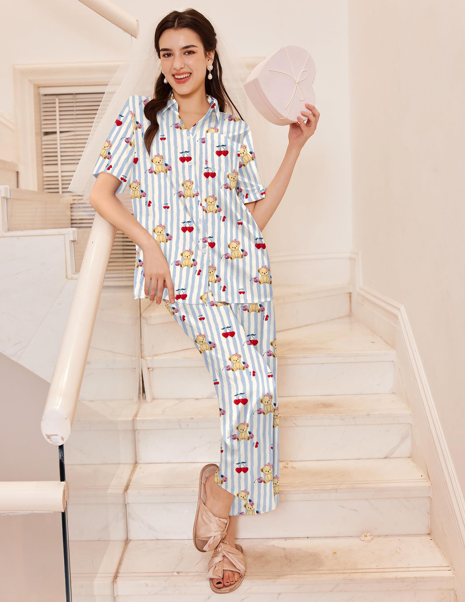 Silk Tops: Short sleeve button down t-shirt, v-neck, and a chest pocket. This pajama shirts can be worn as a casual button blouse shirt. Great for sleeping,casual wear or lounging around the house or yard all day