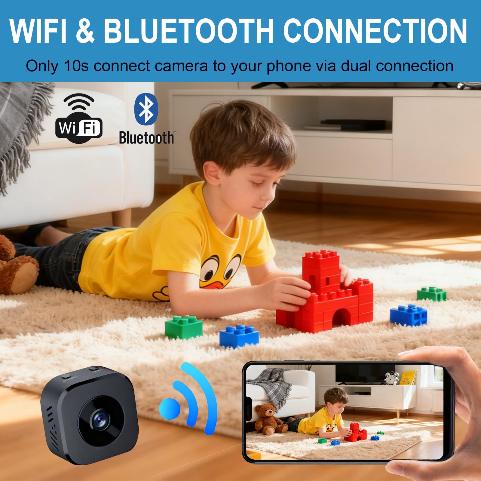 WiFi & Bluetooth Dual Connectivity for 10-Second Quick Setup:Unlike most small cameras (only single WiFi, often slow, complicated setup), the M5 mini camera uses advanced dual-connection tech. It combines WiFi and Bluetooth, letting you pair it with your home network in just 10 seconds—no tedious steps. Both tech novices and pros can set it up easily for smooth remote home security monitoring.