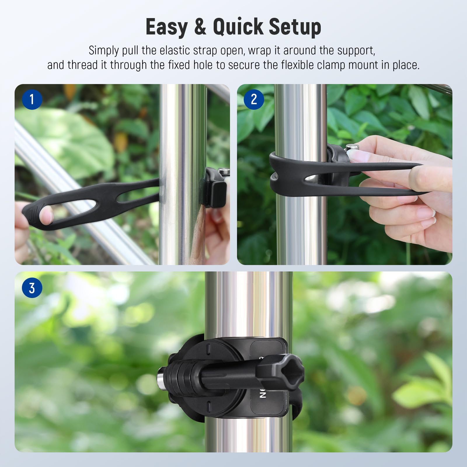 【Easy & Quick Setup】 Simply pull the elastic strap open, wrap it around the support, and thread it through the fixed hole to secure the flexible clamp mount in place - it is a breeze!