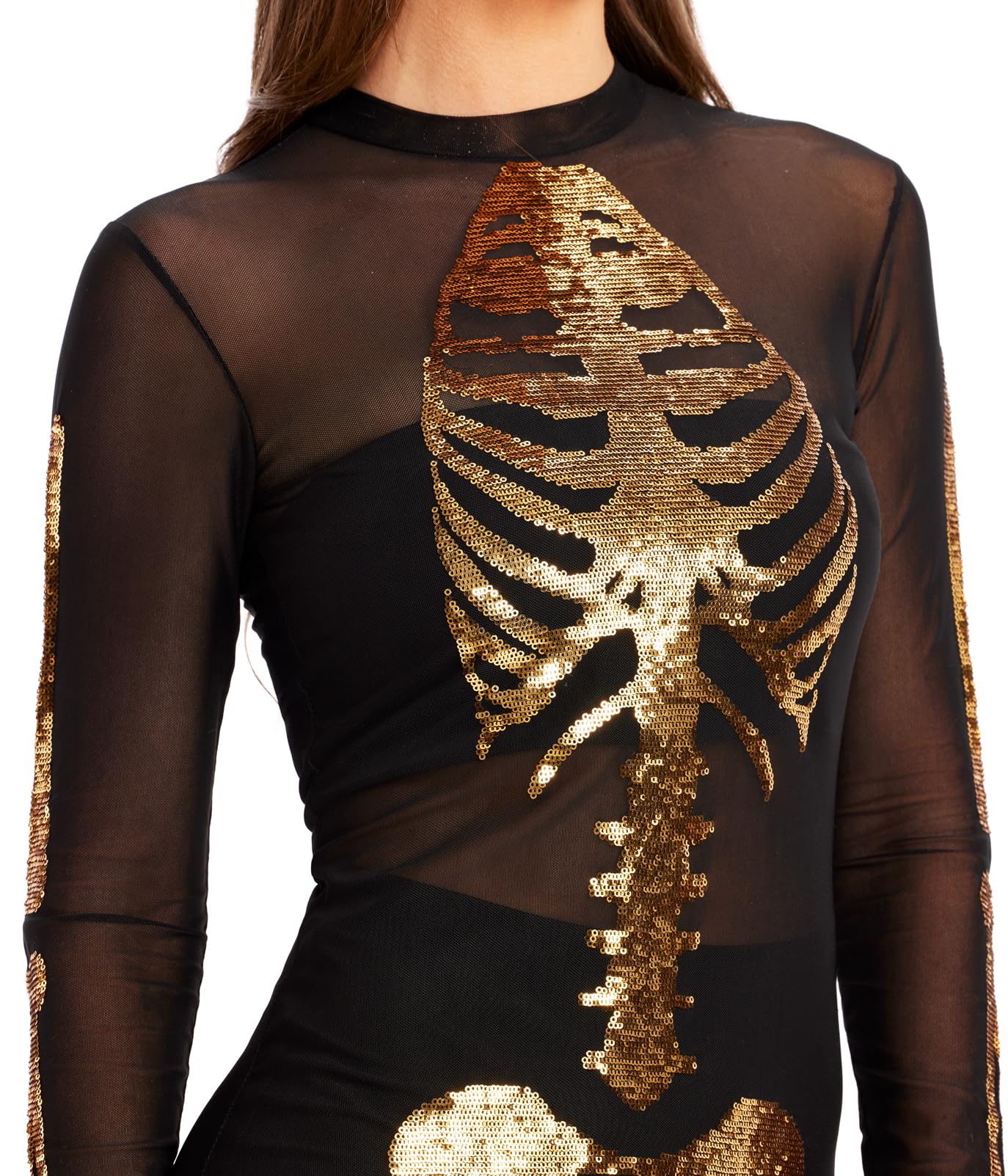 FRONT AND BACK PRINT Our womens gold mesh skeleton costume bodysuit showcases a full front and back print that creates a bone-chillingly complete look, perfect for making an entrance at any Halloween bash!