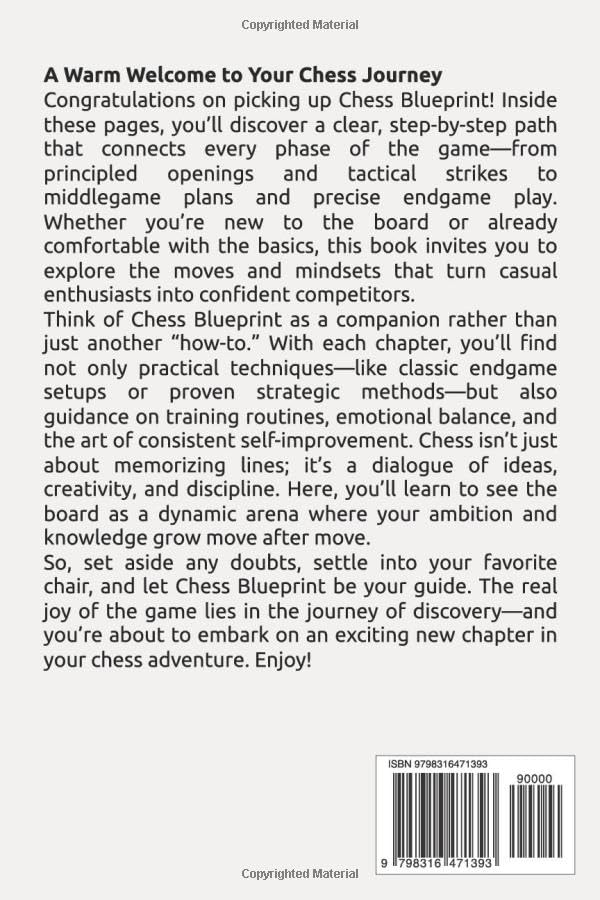 🎄 Give the gift of intelligence, strategy, and lasting enjoyment this Christmas. This book is more than just a present—it's a journey of personal growth for anyone who loves to challenge their mind. Perfect for friends, family, or colleagues who enjoy learning and competition: they'll develop strategic thinking, sharpen their focus, and discover the satisfaction of winning with clarity and purpose. Do you feel stuck at your current chess level, like you're never quite breaking through? Have opening books and YouTube videos left you more confused than confident? Do you wish you could play with real confidence—knowing exactly what to do at every stage of the game? If you answered YES to at least one of these questions, you MUST KEEP READING… Become a feared, strategic player—without memorizing endless lines or wasting time If you're tired of losing games without understanding why... you're not alone. Many ambitious players feel frustrated, stuck, and unsure of their next move. They've tried opening-heavy guides or theory-drenched manuals, yet the results never seem to come. The problem isn't your talent—it's your method. Without a structured, practical roadmap, every match feels like a coin toss. But don’t worry, you’re not alone on this path… “Chess Blueprint” is your turning point. Created by passionate player Viktor Rozhinsky—who tested hundreds of real-world strategies—this book isn’t another pile of tactics or memorized traps. It’s a unique, step-by-step system that transforms the way you think, plan, and play. From mindset to game analysis, from practical openings to tactical mastery and strategic vision—you’ll finally learn to play like a master, not just mimic one. • Foundations for victory: Build a winning mindset and strong strategic core • Master the board: Control the center and read the position like a battlefield • No more memorization: Handle openings logically—without getting lost in theory • Tactics that win games: Forks, pins, sacrifices—train your vision to strike first • Endgames with precision: Learn what really matters when pieces disappear • And much more 🎁 EXTRA CONTENT Exclusive for Amazon readers 🔒 Fending off lightning-speed openings: Learn how to neutralize and counter the fastest f7 traps. 🔥 Legendary checkmates and epic games: Get inspired by iconic finishes from grandmasters and absorb killer patterns. 🧙 Becoming an “opening wizard”: A full roadmap to master the first 15 moves like a seasoned pro. Imagine sitting down at the board with calm and clarity, ready to outthink your opponent at every turn. No more panic, no more guessing. Just confident play, solid plans, and a sense of control you’ve never felt before. This is your transformation. Strategic. Focused. Respected. Grab your copy of “Chess Blueprint” now and begin your journey from casual player to dominant force on the board.