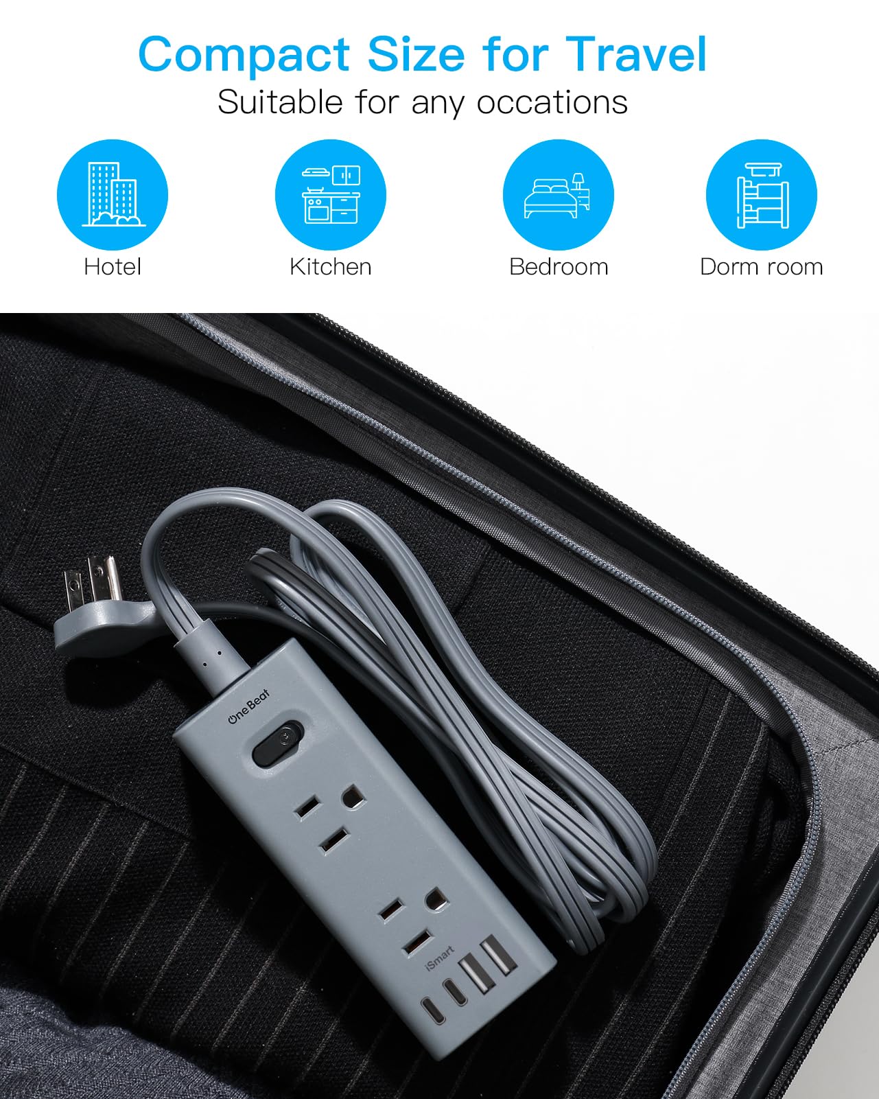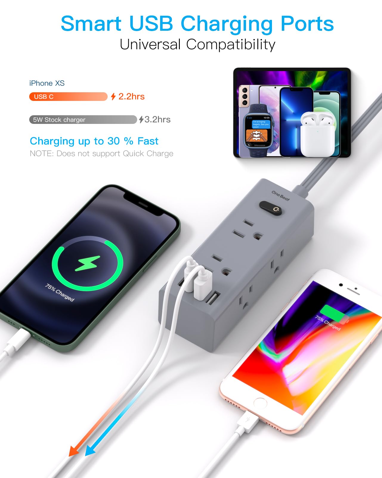 【Ultra Flat Plug Power Strip & 3 Ft Flat Extension Cord】With only 0.35 inch ultra thin plug and 45 degree right angle design, One Beat low profile flat wall plug is mush slimmer than traditional plugs, can close to the wall easily and hide in the back of furniture, bed or refrigerator, no waste for outlet and space. 3 ft extension cord with only 3mm thicker which is made of pure copper, which has better current carrying capacity (15A)