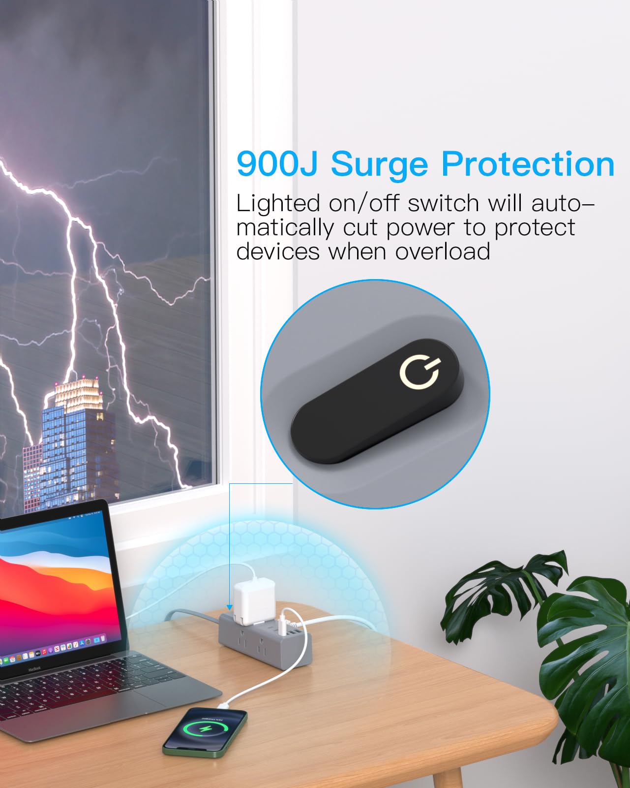 【Surge Protector Power Strip】The electric strip has a 900-Joule energy rating providing a reliable power extension cord to protect your devices and appliances: TV, printers, computer. It secures your electronic devices from overload, short circuit, power spikes, lightning strikes, or fluctuations. (The "SURGE PROTECTED" soft indicator light on to show your devices are protected).