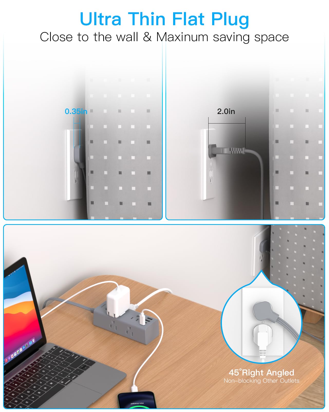 Power Strip with Short Extension Cord 6 widely spaced outlets and 3 USB charging ports, this power strip with USB can charge and power up to 9 devices at the same time. Build in smart charging technology, the desktop charging station can auto-detect your devices and provide optimized charging for cellphone, laptop, tablet. Easily plug in your PC, monitor, printer. Plug Type:0.35" Ultra Thin Flat Plug with 45° Right Angled USB Ports:3 USB Ports ( 1 USB-C + 2 USB-A) AC Outelts:6 Widely AC Outlets USB-C Outlet:5V/3A Max USB-A Outlet:5V/2.4A Max USB Output(Total):5V/3.1 A Electrical Rating:1875W/125V/15A/60Hz Cord Length:1-25 Ft Flat Extension Cord Surge Protector Rating: 900 joules Product Size: 5.0*1.9*1.8 inch