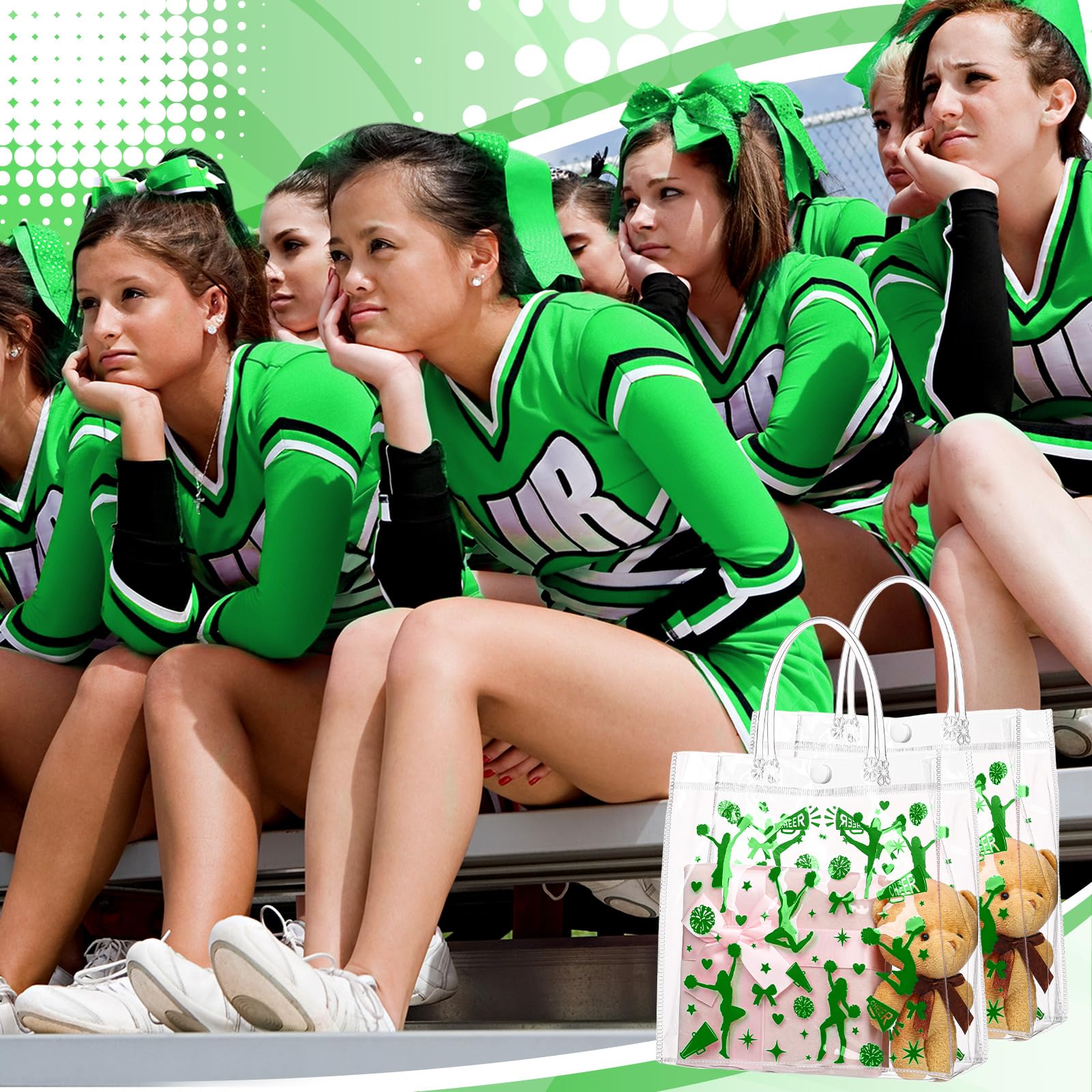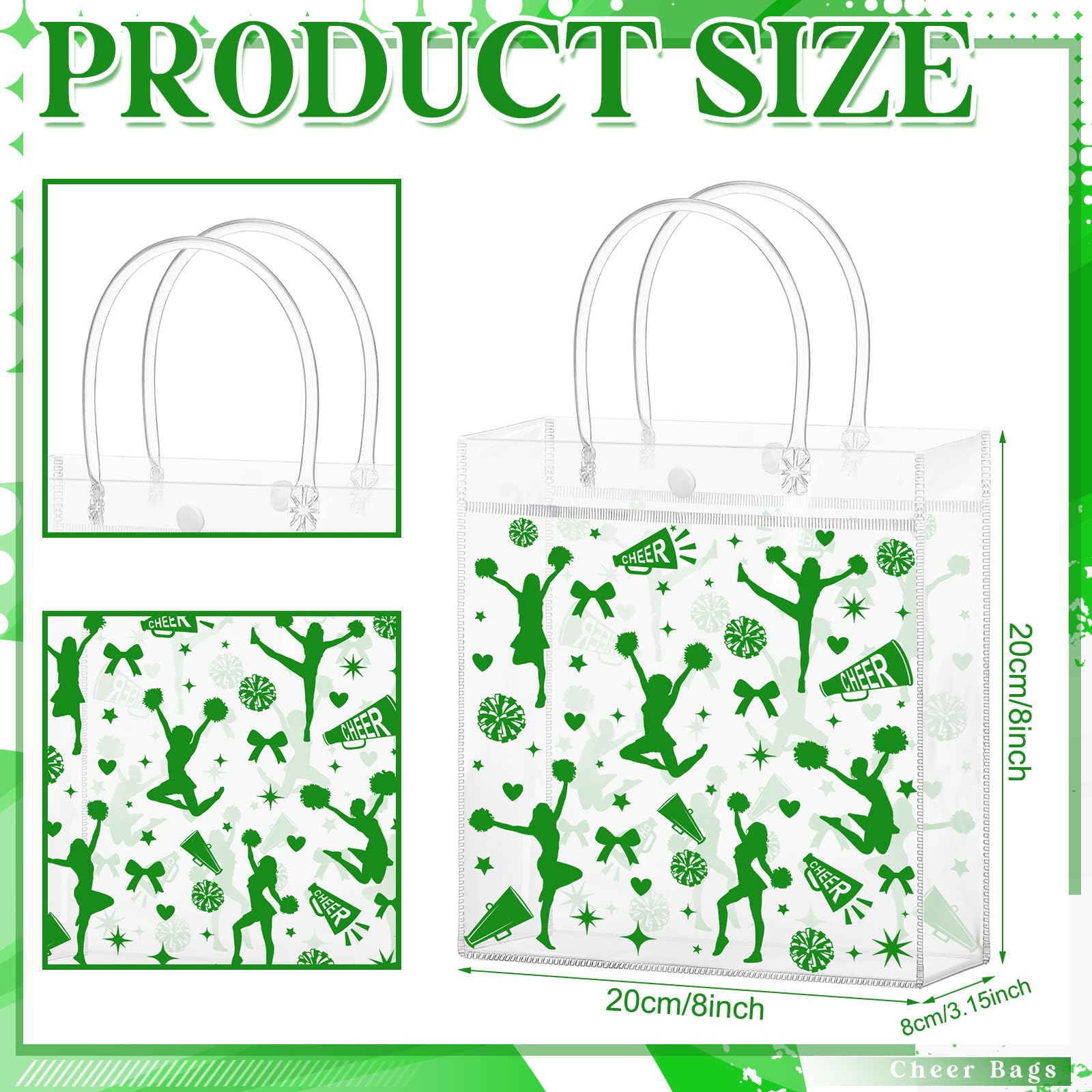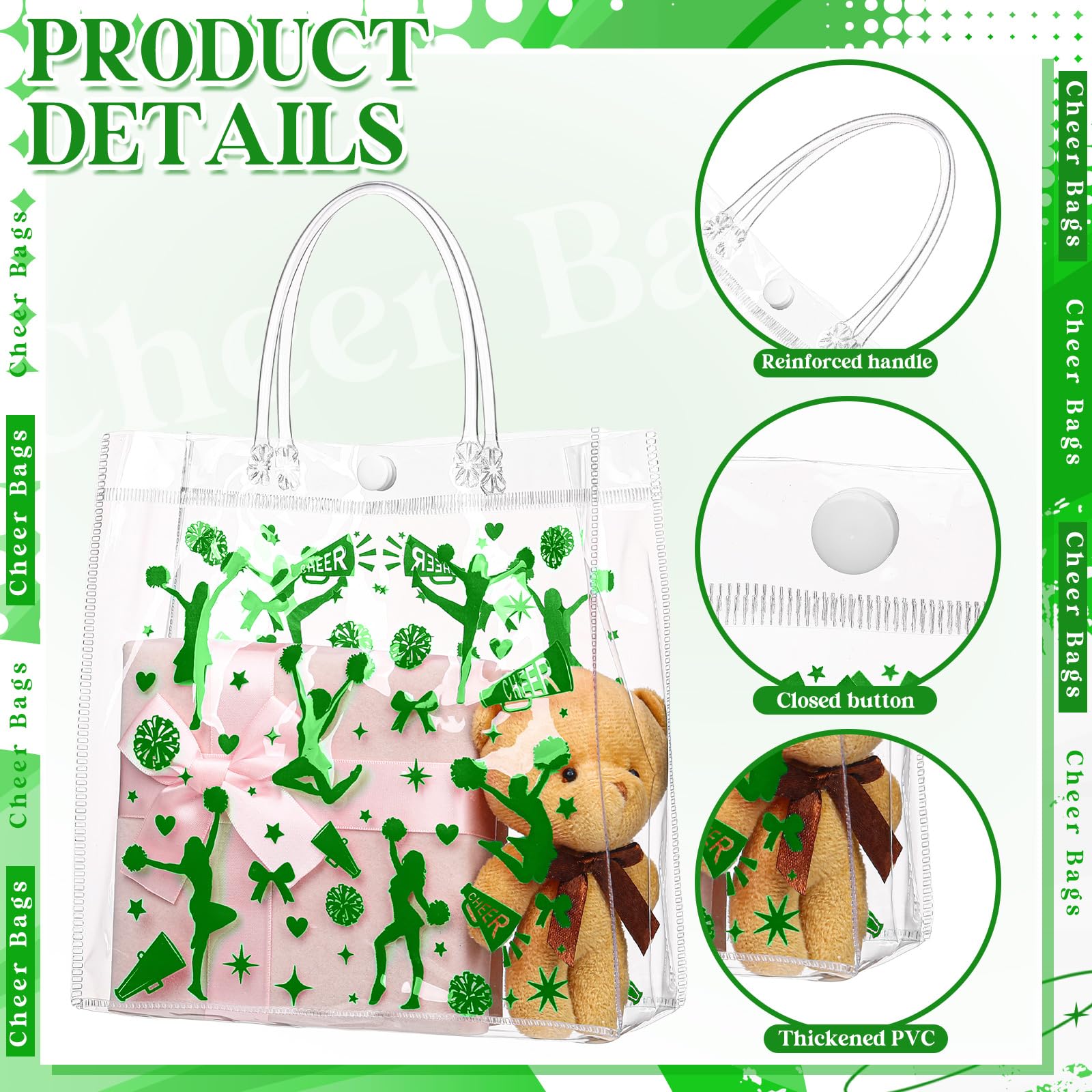 Durable Craftsmanship: crafted from PVC material, these cheerleading goodie bags offer durability and feature reinforced handles that resist breakage, securely holding your items and preventing accidental drops