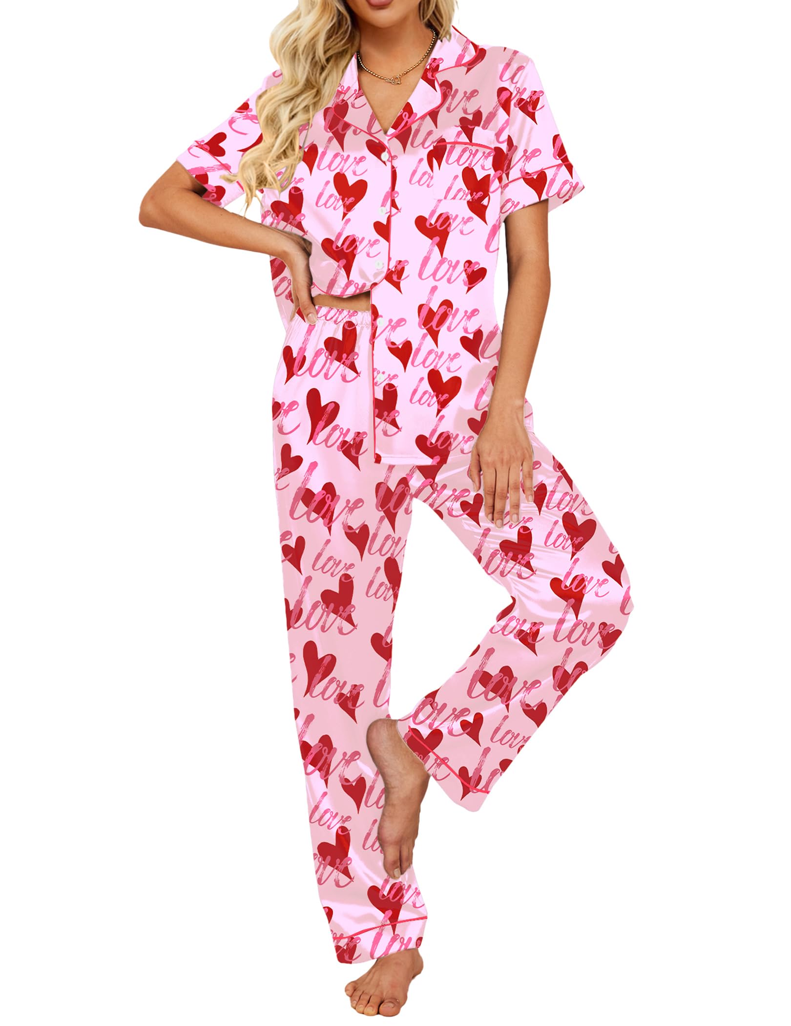 Classic Button Down Pajamas: The relaxed fit two piece comfortable loungewear features the silk bottoms with elastic waist and matches a silky-smooth short-sleeve V-neck top with a chest pocket. Suitable for all seasons. Classic full button up pj set is easy to put on and take off.