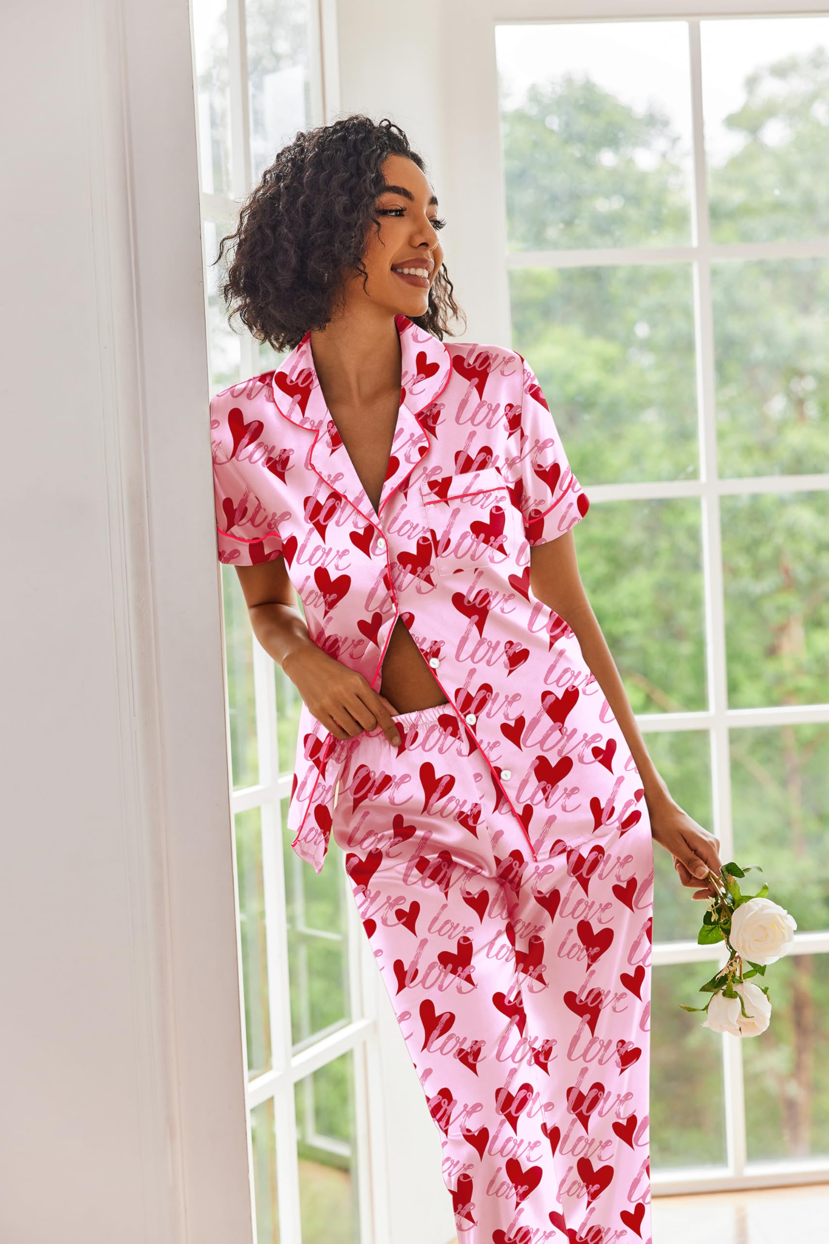 Soft Satin Pajama Set: Made of premium 95% Polyester, 5% Spandex silk satin, the pajama set for women is lightweight, breathable and skin-friendly, just like wrapped in a cloud, helping you have a sound sleep.