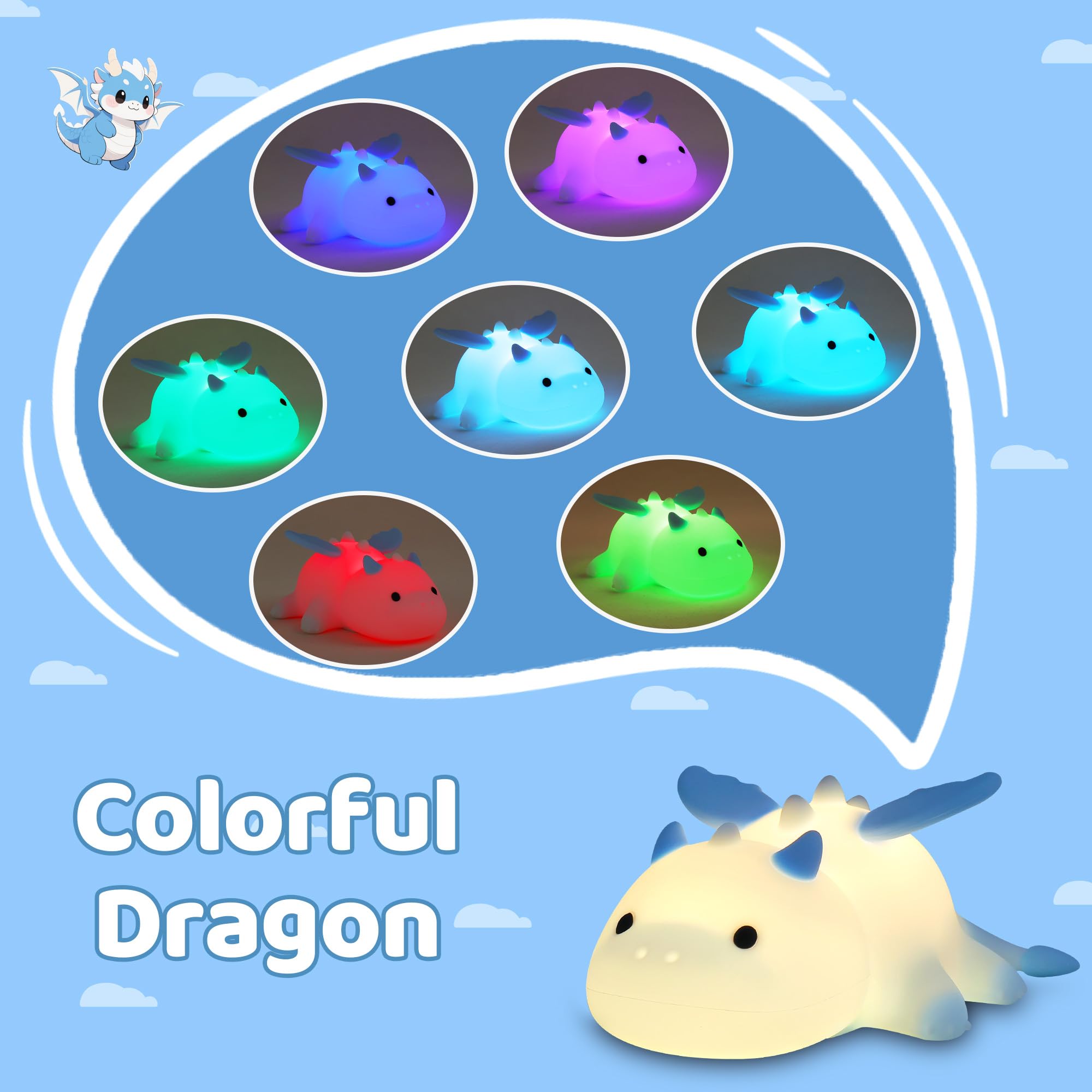 Easy Use and Fun Touch Control: Toggle the switch to "RGB" to activate lighting. Gently press or squeeze the adorable dragon to cycle through 7 dynamic RGB hues. In this mode, the lights will automatically turn off after 30 minutes. When switched to warm light mode, tap repeatedly to adjust 3-level brightness, offering versatile illumination for various scenarios.
