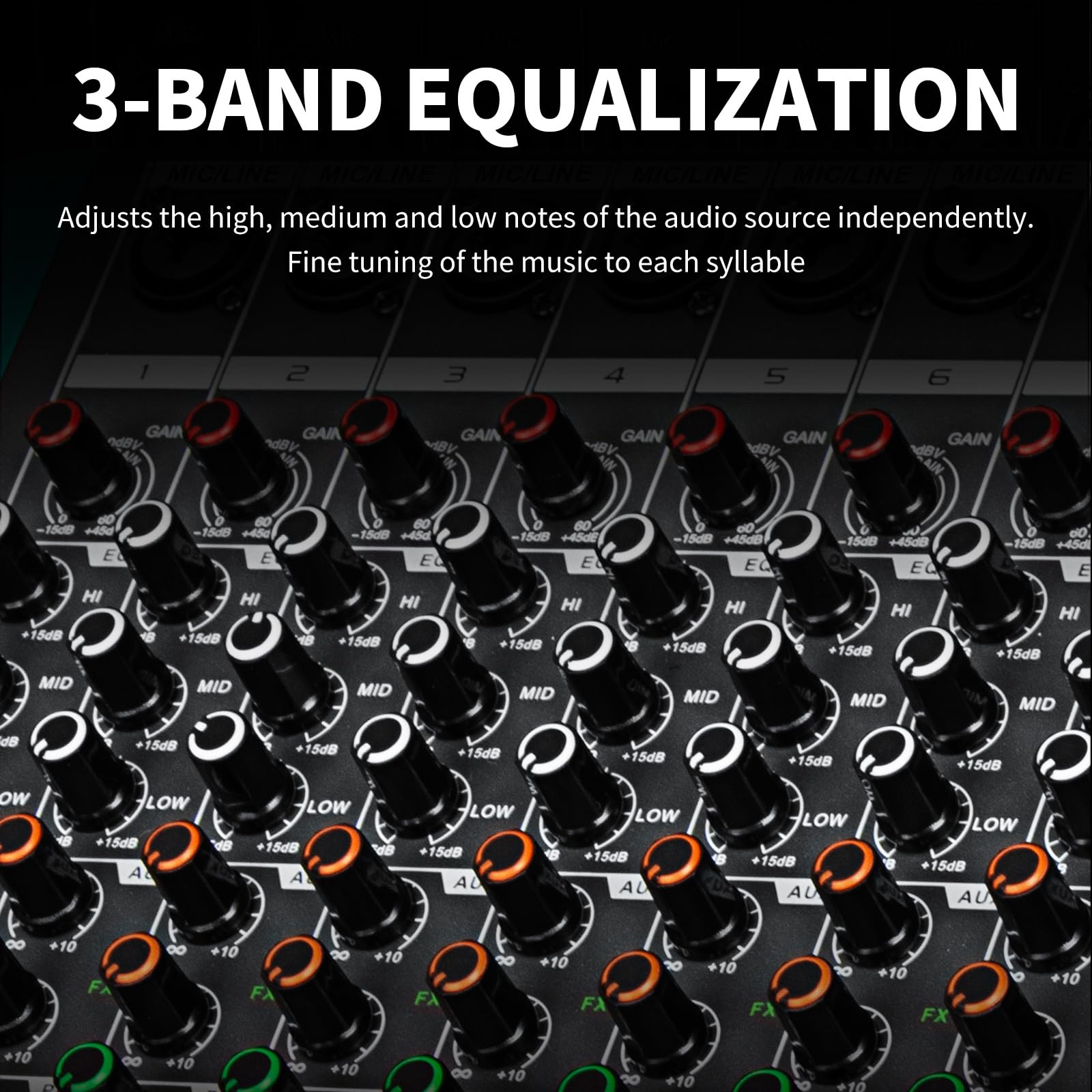 12-Channel DJ Mixer: The mixer is ideal for multi-device connections as it has 12 channels, each with an mix XLR mic and 6.35mm inputs. Plus XLR outputs, 1/4'' (L/R) outputs, each pair of RCA (L/R) inputs and outputs.
