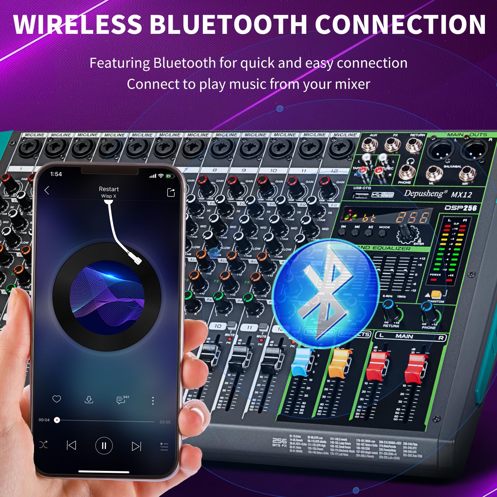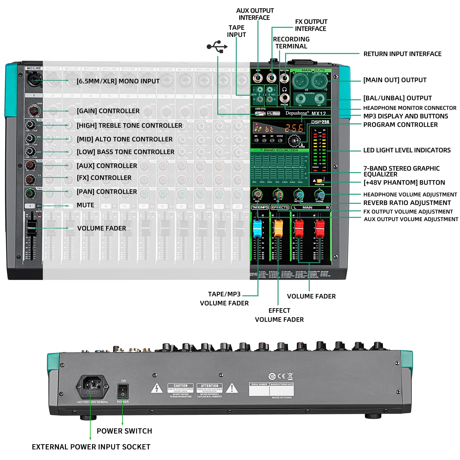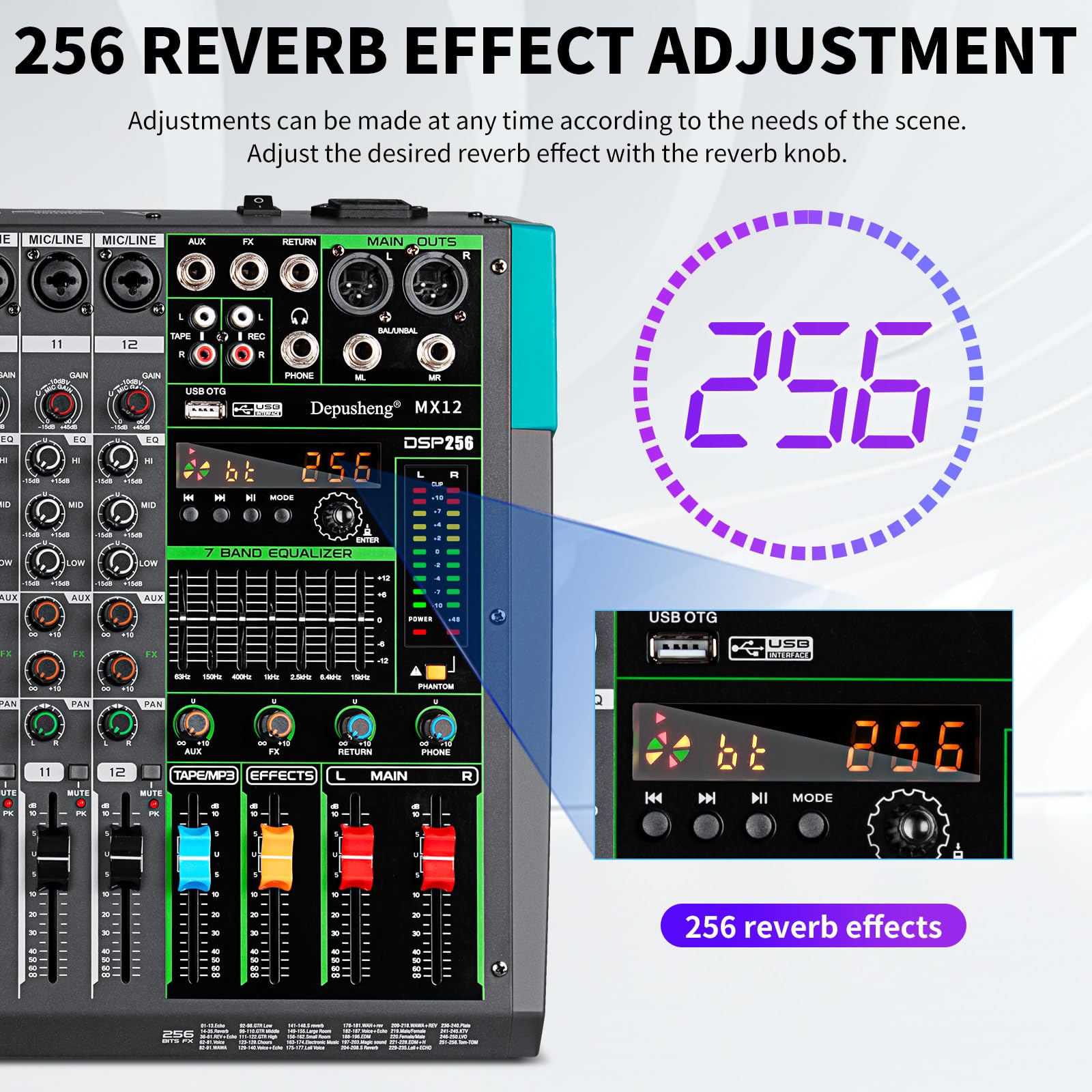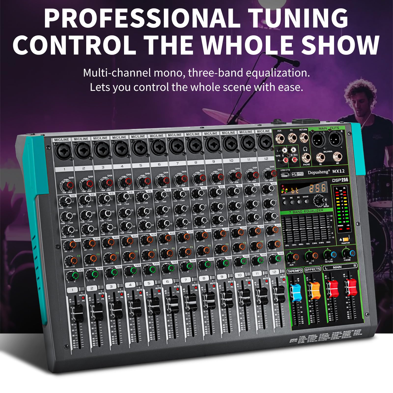 12 channel mixer, with MUTE , MP3 function with USB and DSP digital effects, rotary compressor for easy control, stronger bass and cleaner vocals.