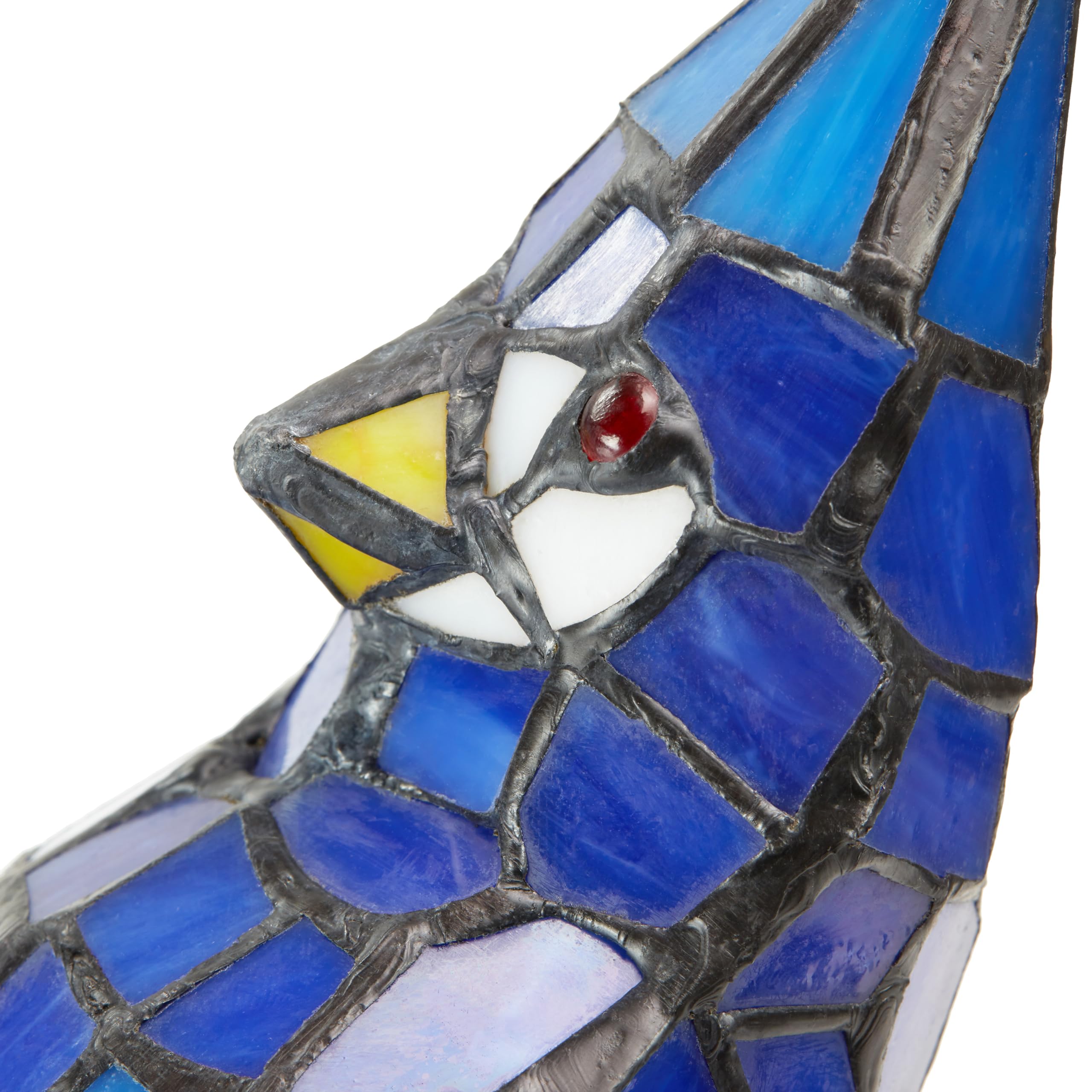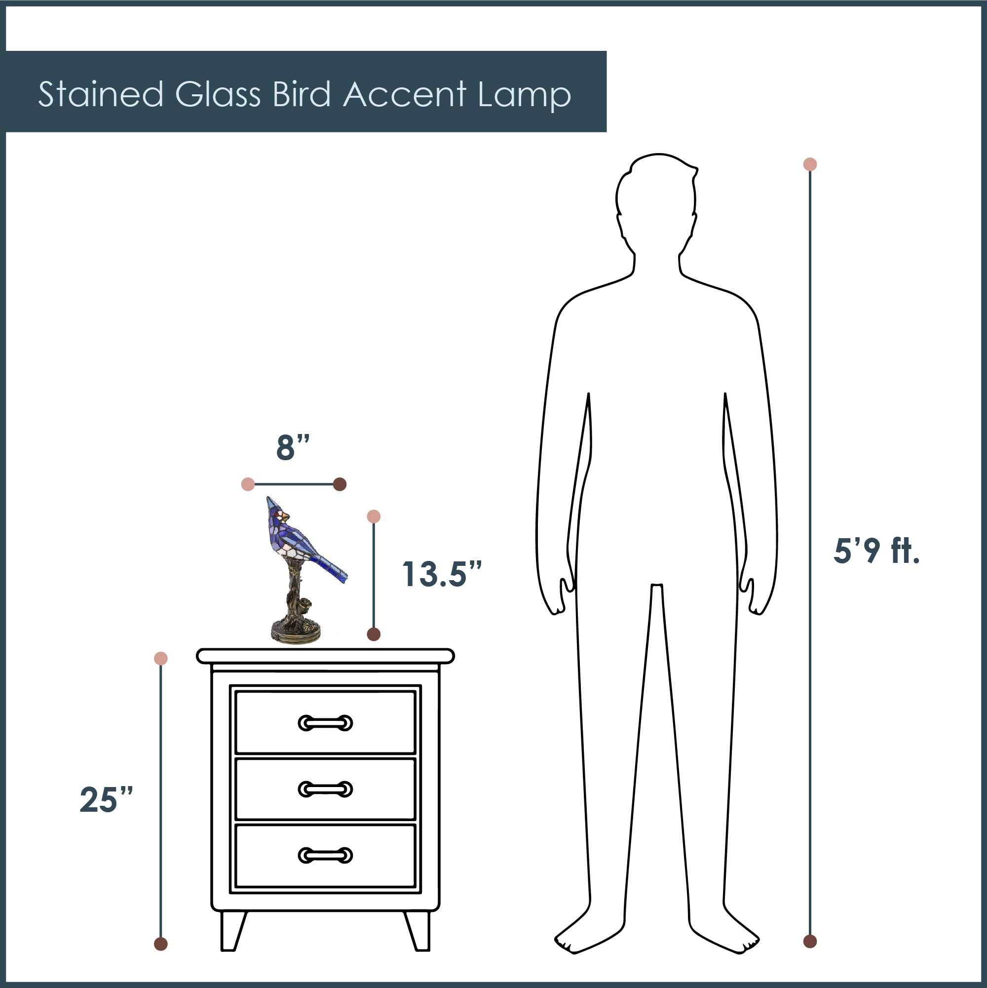 TIFFANY TABLE LAMP: Fabricated from 95 pieces of glass, individually wrapped in copper foil, and hand-soldered. Our electric bird lamp includes a sturdy polyresin base, comes with a 61-inch cord, inline switch, and measures 4.5" D x 8" W x 13.5" H.