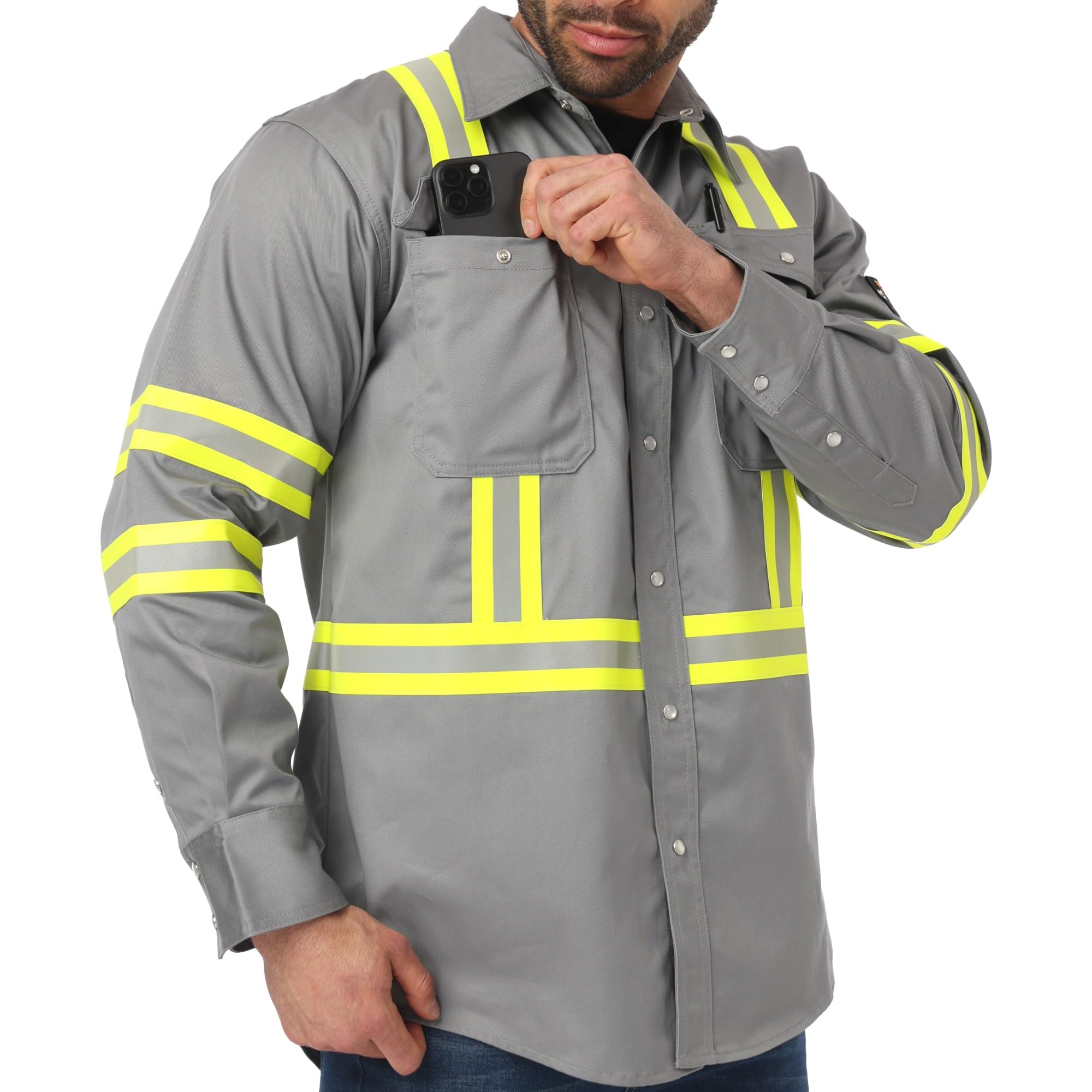 Practical Designed with Low-Light condition: The JKSafety Welding shirts features hi vis reflective strips on the chest, back, waist, and arms, enhancing 360°visibility to ensure co workers and machine operators can see you easily. The FR Clothing also includes a flame-resistant YKK snap-button closure for quick and easy wear, along with two snap-button chest pockets for convenient storage of personal items. Ideal for welders, ironworkers, construction workers. camisas fr para hombre de trabajo.