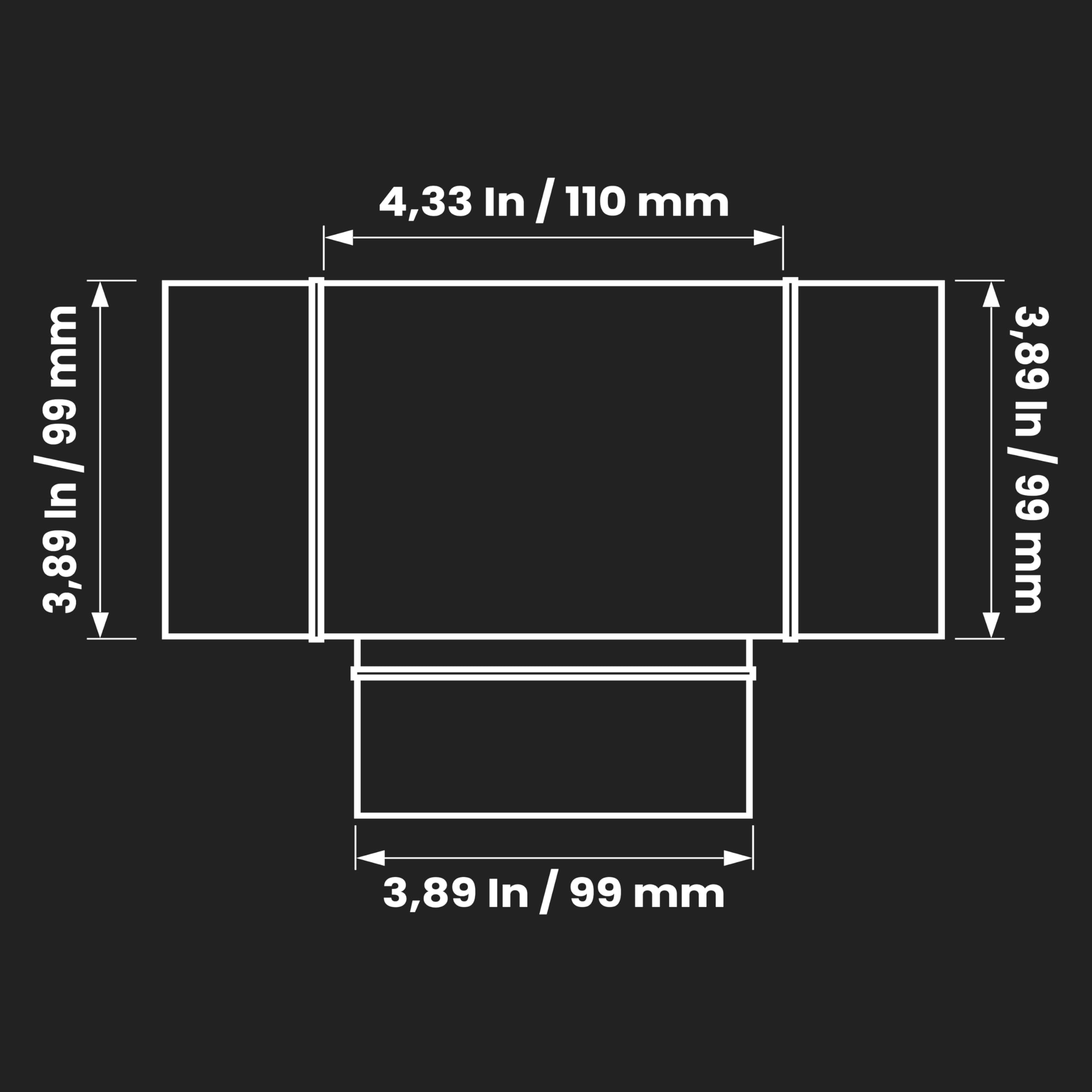 Equal T piece male spigot: Insertion diameter: 3.89" Inch will fit into round 4" Inch / 100 mm ventilation pipe.