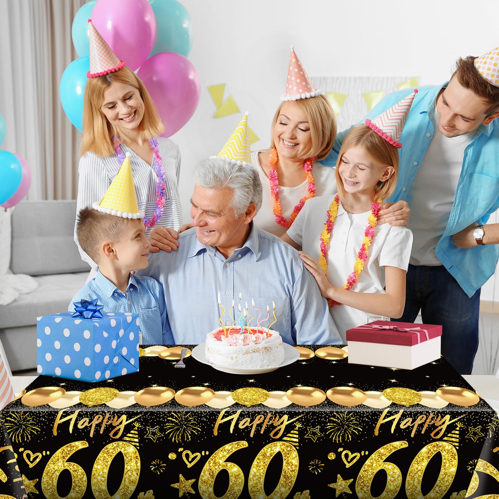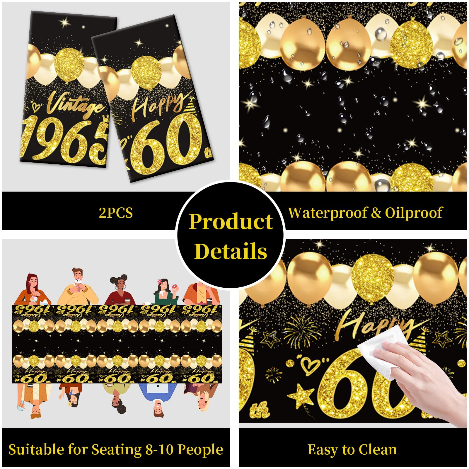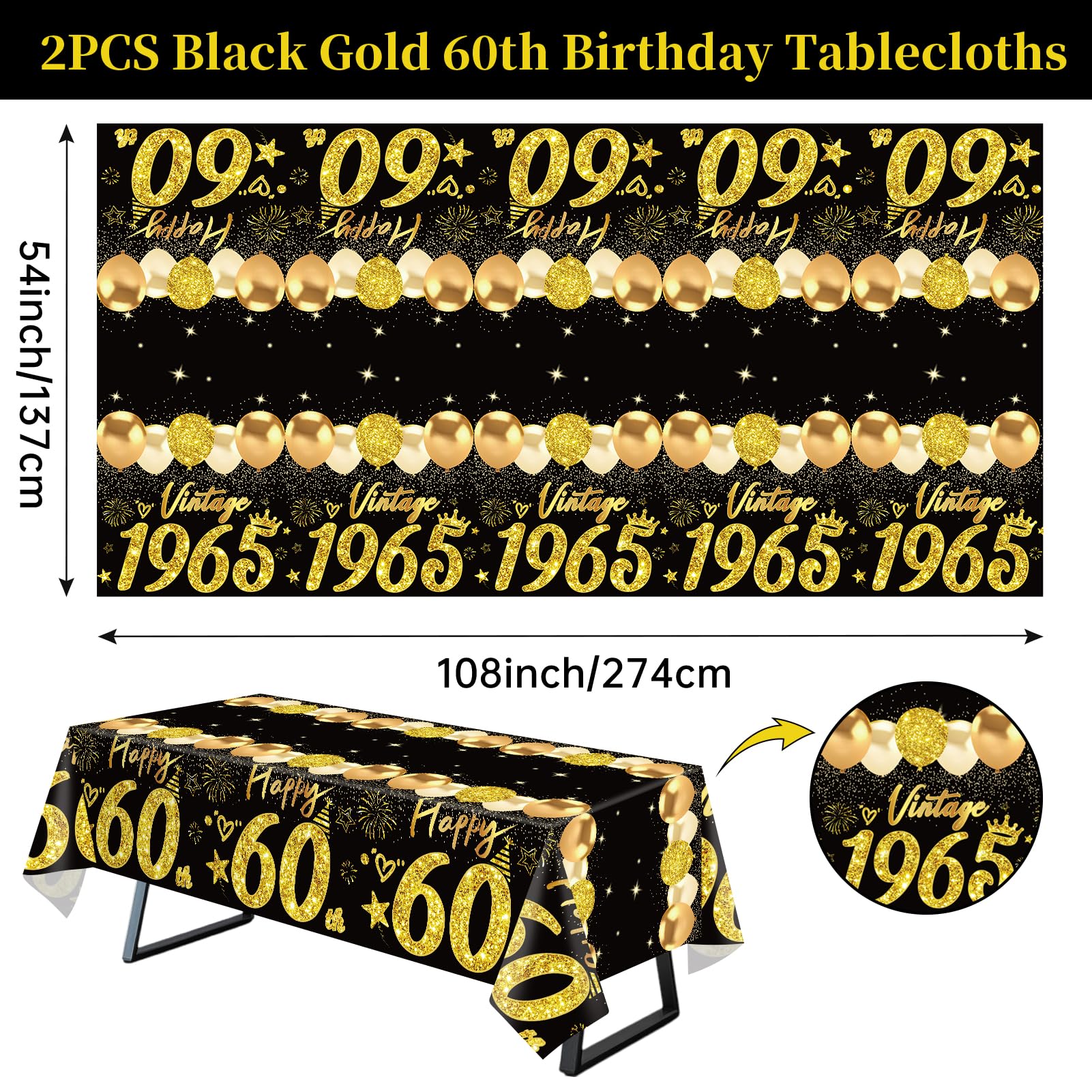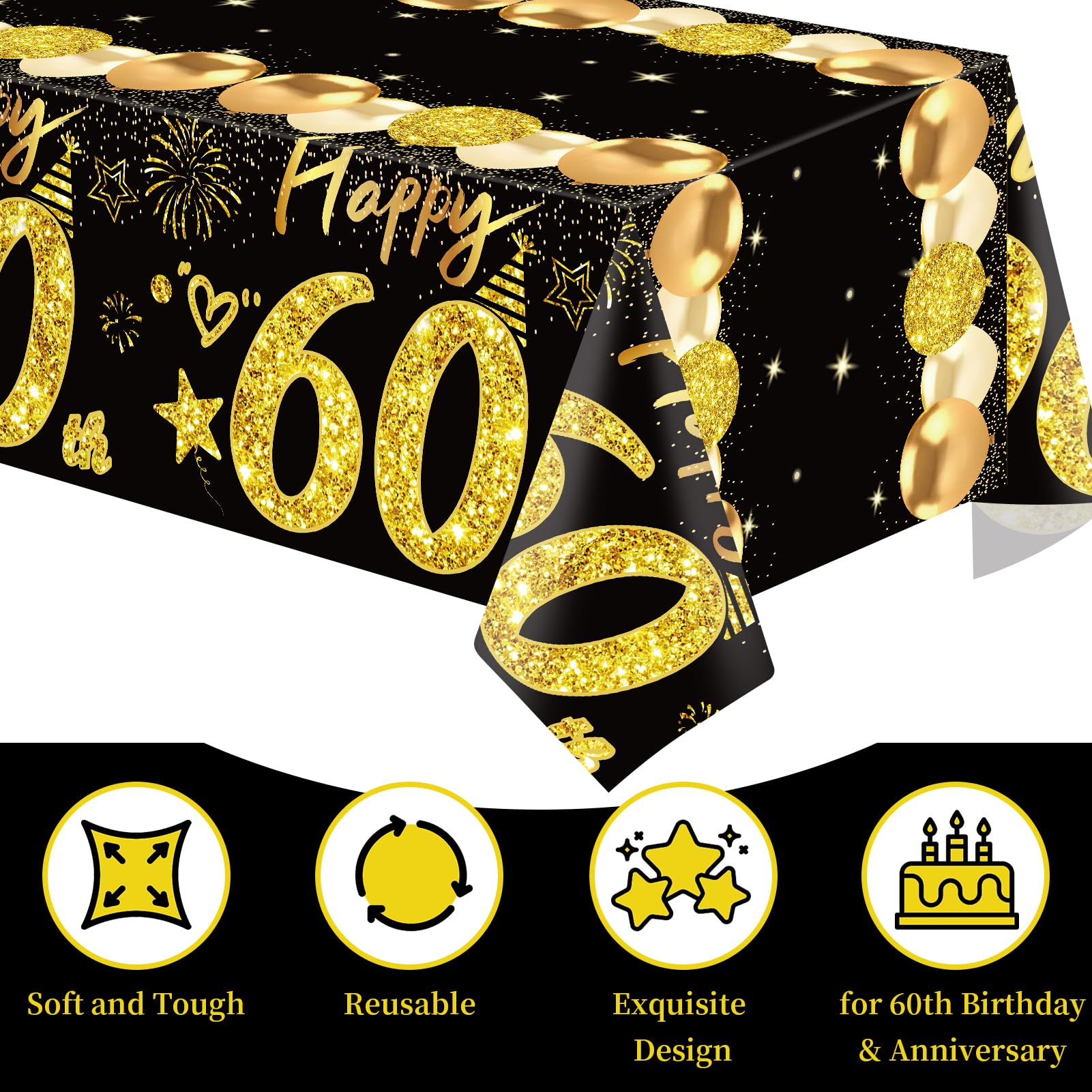 You Will Get: 2pcs black gold 60th birthday table clothes (108 x 54 inch), fit most rectangular tables and a few round table