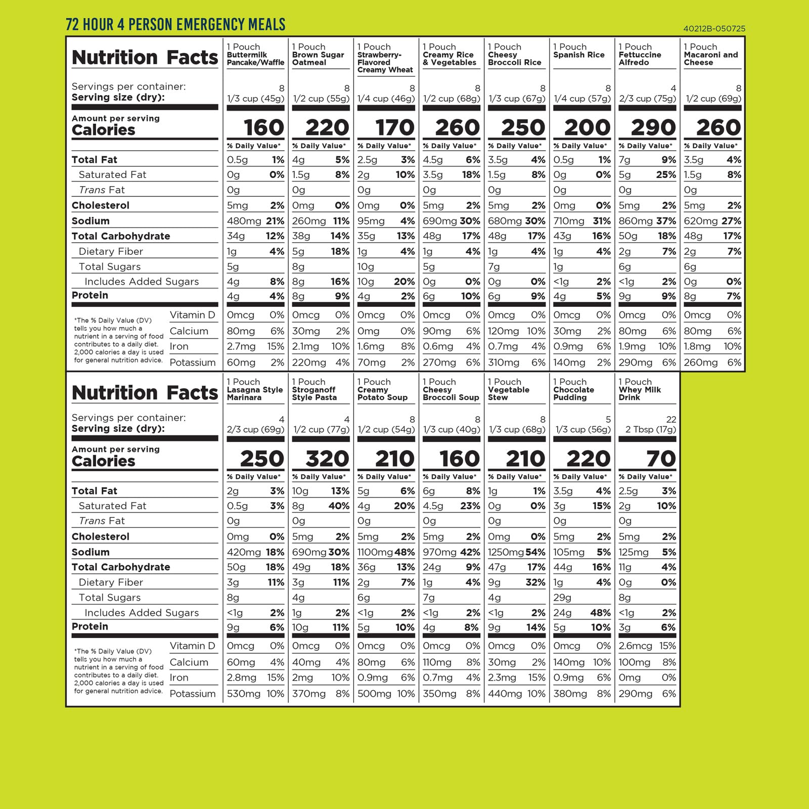 PREPARED FOODS - Augason Farms 72 Hour Kit includes oatmeal, pancake mix, creamy wheat, rice & veggies, cheesy broccoli rice, Spanish rice, fettuccine alfredo, mac & cheese, marinara, stroganoff, potato soup, veg stew, broccoli soup, pudding & whey milk