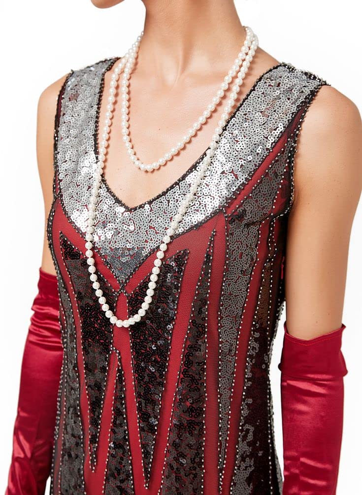 Package:1* 1920S Sequin Flapper Dress , 1* Pearl necklace, 1* pearl Earring, 1* Pearl Bracelet, 1*Feather Headband, 1 x Long Satin Gloves, 1* Cigarette Holder.