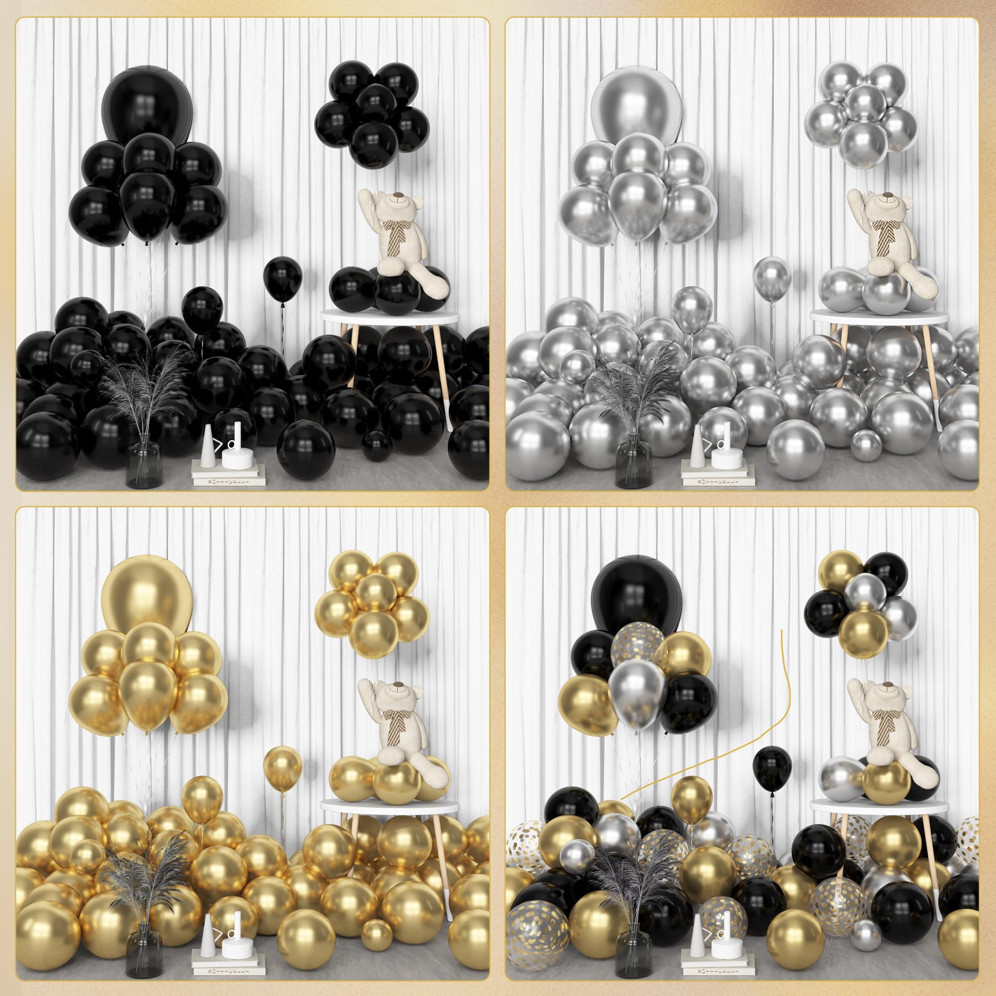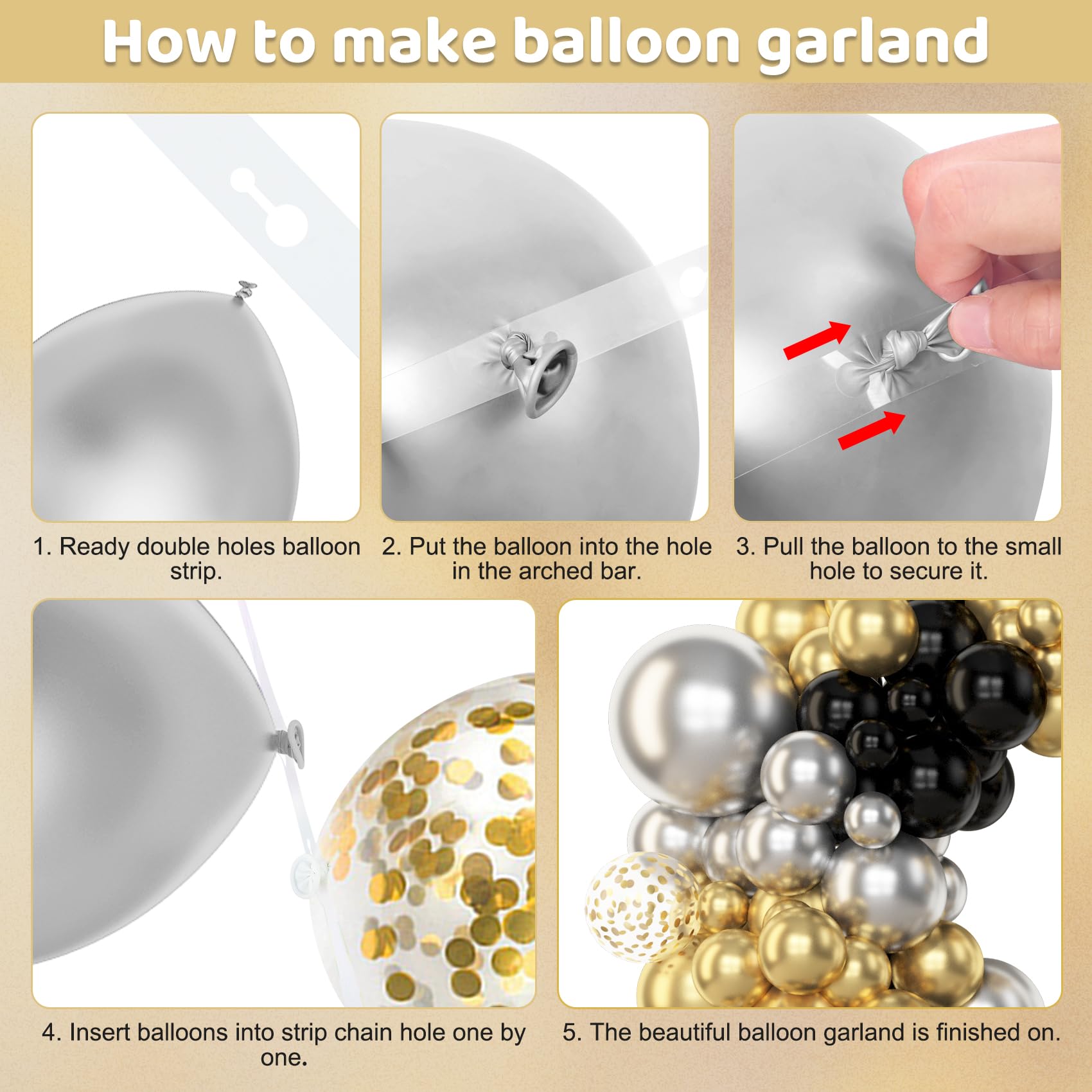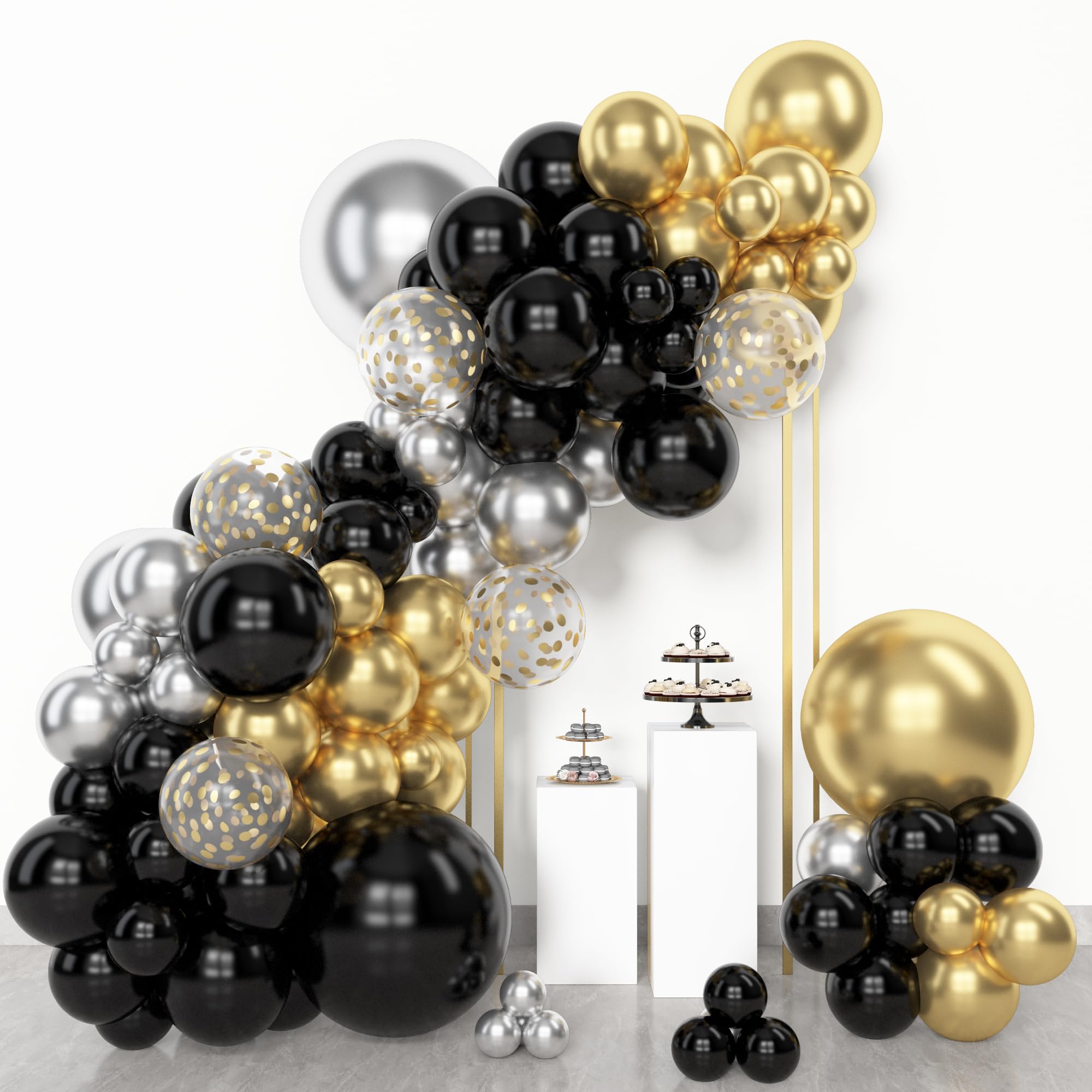 Sufficient Quantity of Black and Gold balloons: The black and gold balloon arch kit includes 18” silver black and gold balloons(3 pcs), 12” metallic gold/metallic silver/black/gold confetti balloons(20 pcs), 10” metallic gold/metallic silver/black balloons(55 pcs), 5” metallic gold/metallic silver/black balloons(65 pcs) and 10 pcs balloon tools(flower balloon clips, hooks, balloon arch strip, tying tool, glue points, ribbon)