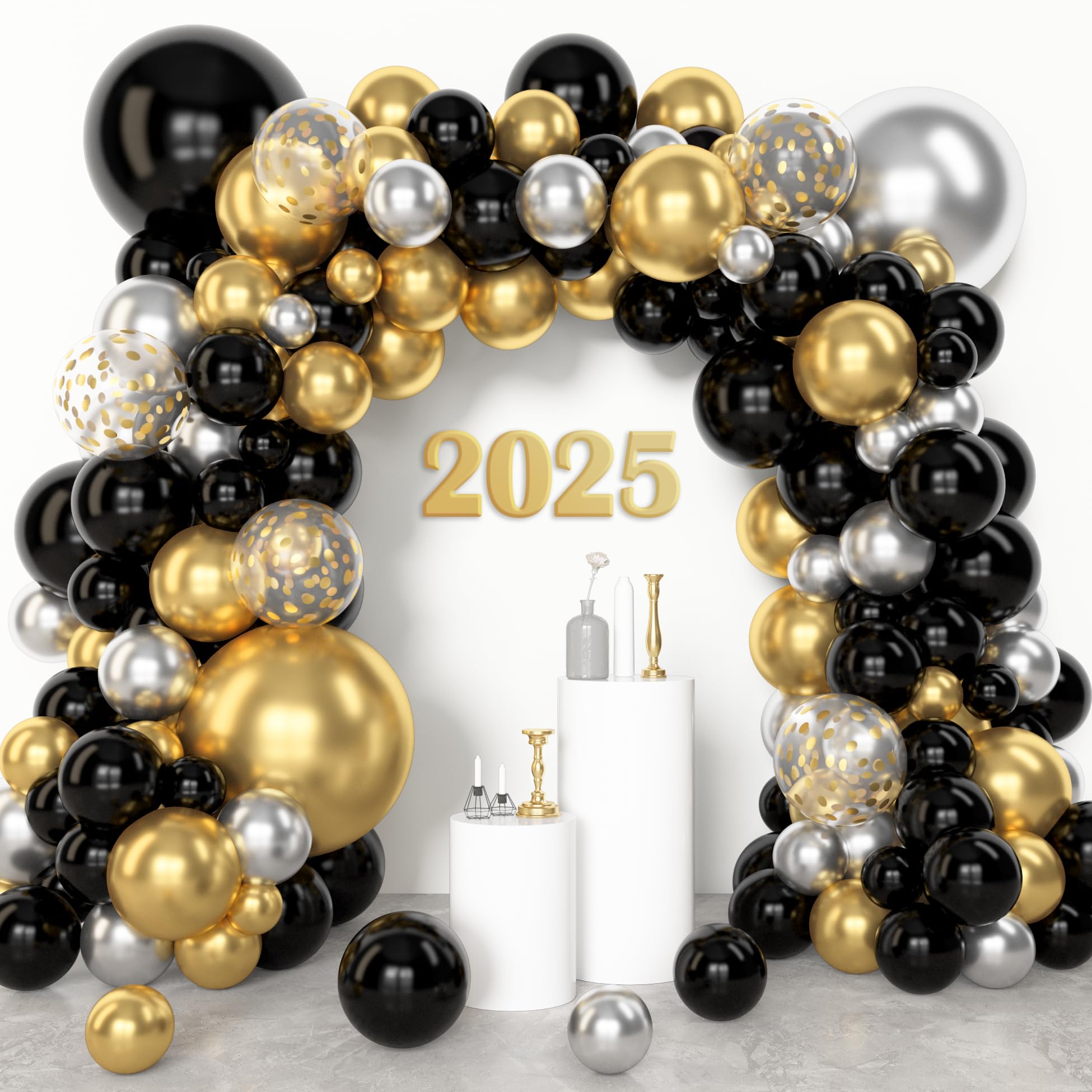 Premium New Years Balloons: We take great pride in the quality of our black and gold balloon arch, which have undergone rigorous testing to ensure their accessibility to children; Our black and gold balloons are made of great-quality latex that is easy to inflate and available for kids to use; The black and gold balloons are also decent, flexible, and not easily broken; Come and enjoy a happy party with black and gold balloon arch
