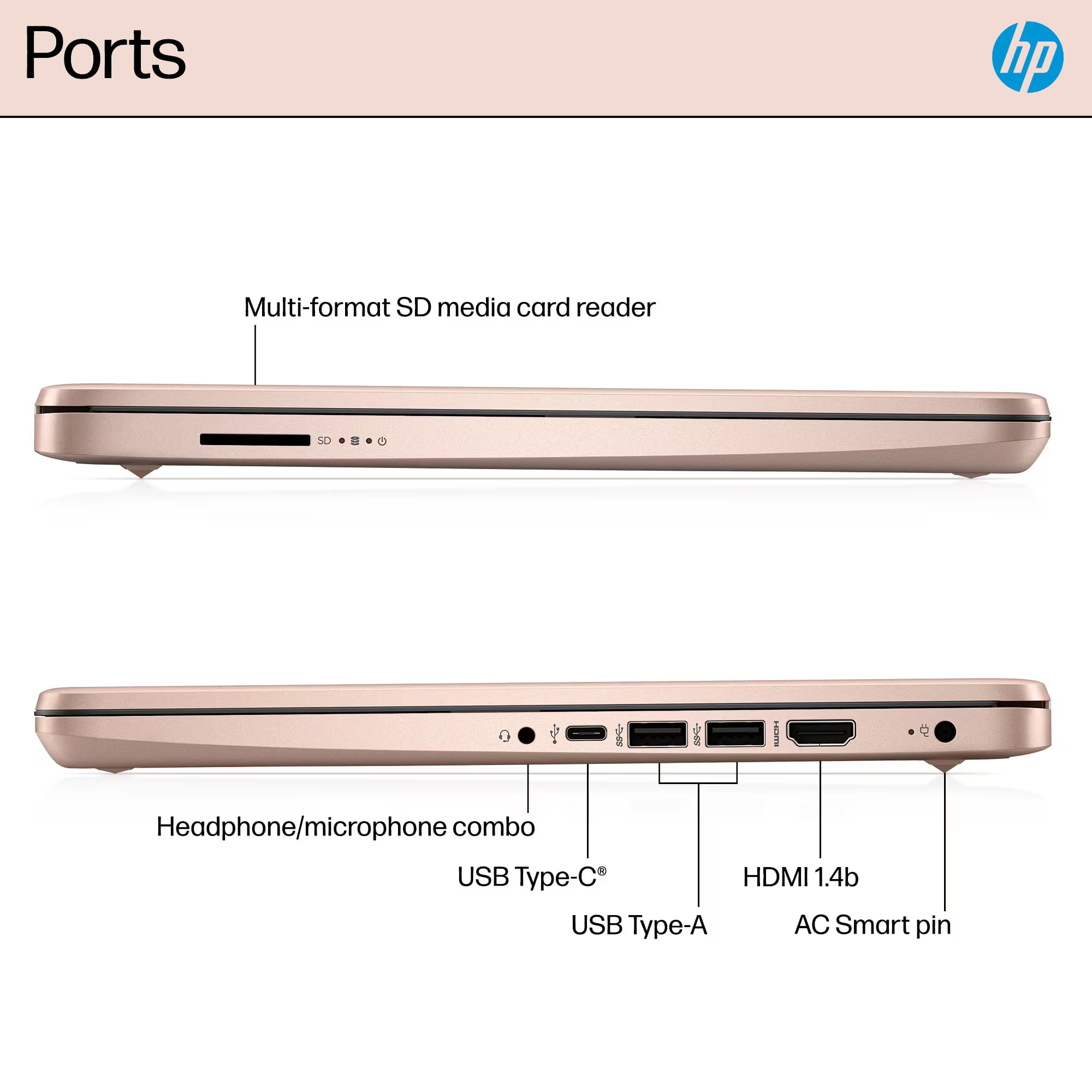 Performance to do more. All-day long. Designed to keep you productive and entertained, this HP 14-inch laptop PC features Copilot key for AI assistance, long battery life and a thin and portable design. The long-lasting battery life and HP Fast Charge help you stay in the zone longer. Bundle with HubxcelAccessory: Wireless earbuds, 500GB external drive, USB extension cord, HDMI cable, mouse pad, and wireless mouse Processor: Quad-Core Intel Processor N150 (Up to 3.6 GHz Max Turbo Frequency, 6 MB Intel Smart Cache, 4 cores, 4 threads) Graphics: Intel Graphics Operating system: Windows 11 Home in S Mode Software: Free 1-year Microsoft Office 365 Subscription Memory: 16GB DDR4 Storage: 628GB (128GB UFS + 500GB External Drive) Display: 14-inch diagonal, HD (1366 x 768), micro-edge, anti-glare, 250 nits Connectivity: Wi-Fi 6 and Bluetooth 5.4 combo Audio: HD Audio with stereo speakers Keyboard: English, natural silver keyboard Webcam: HP True Vision 720p HD camera with temporal noise reduction and integrated dual array digital microphones Ports: 1x USB Type-C 10Gbps signaling rate (supports DisplayPort 1.2) 2x USB Type-A 5Gbps signaling rate 1x Headphone/microphone combo 1x AC Smart pin 1x HDMI 1.4b Battery: 3-cell, 41 Wh Li-ion battery, Up to 9 hours Color: Rose Gold Dimensions (W x D x H): 12.76 x 8.86 x 0.71 in Weight: 3.24 lbs