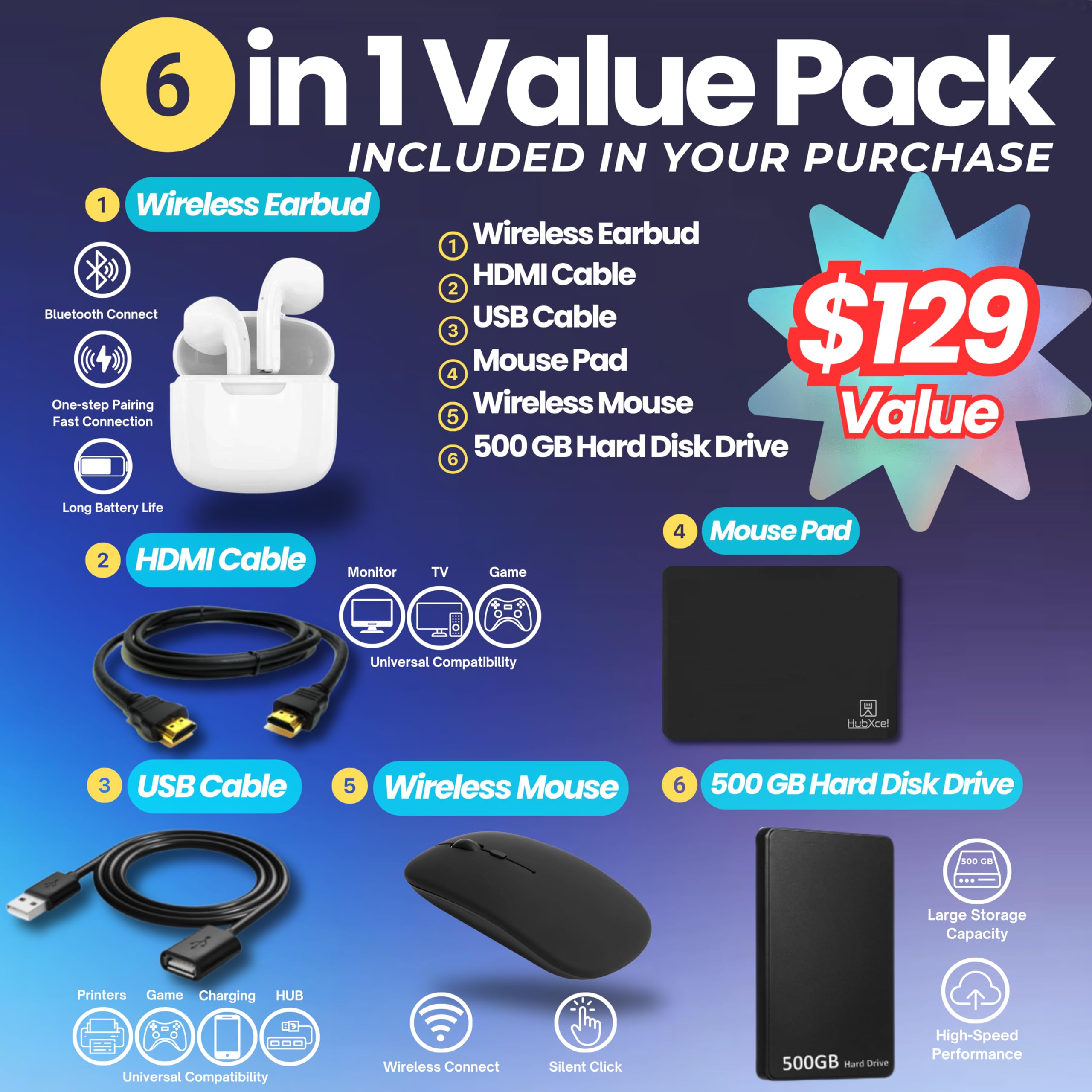 [6-in-1 HubxcelAccessory with 1-Year MS Office 365] HubxcelAccessory includes wireless earbuds, 500GB external drive, USB extension cord, HDMI cable, mouse pad, and wireless mouse. Free Microsoft Office 365 Personal 1-year subscription included Al Powered Copilot. For Home, Student, Professionals, Small Business, School Education, and Commercial Enterprise.