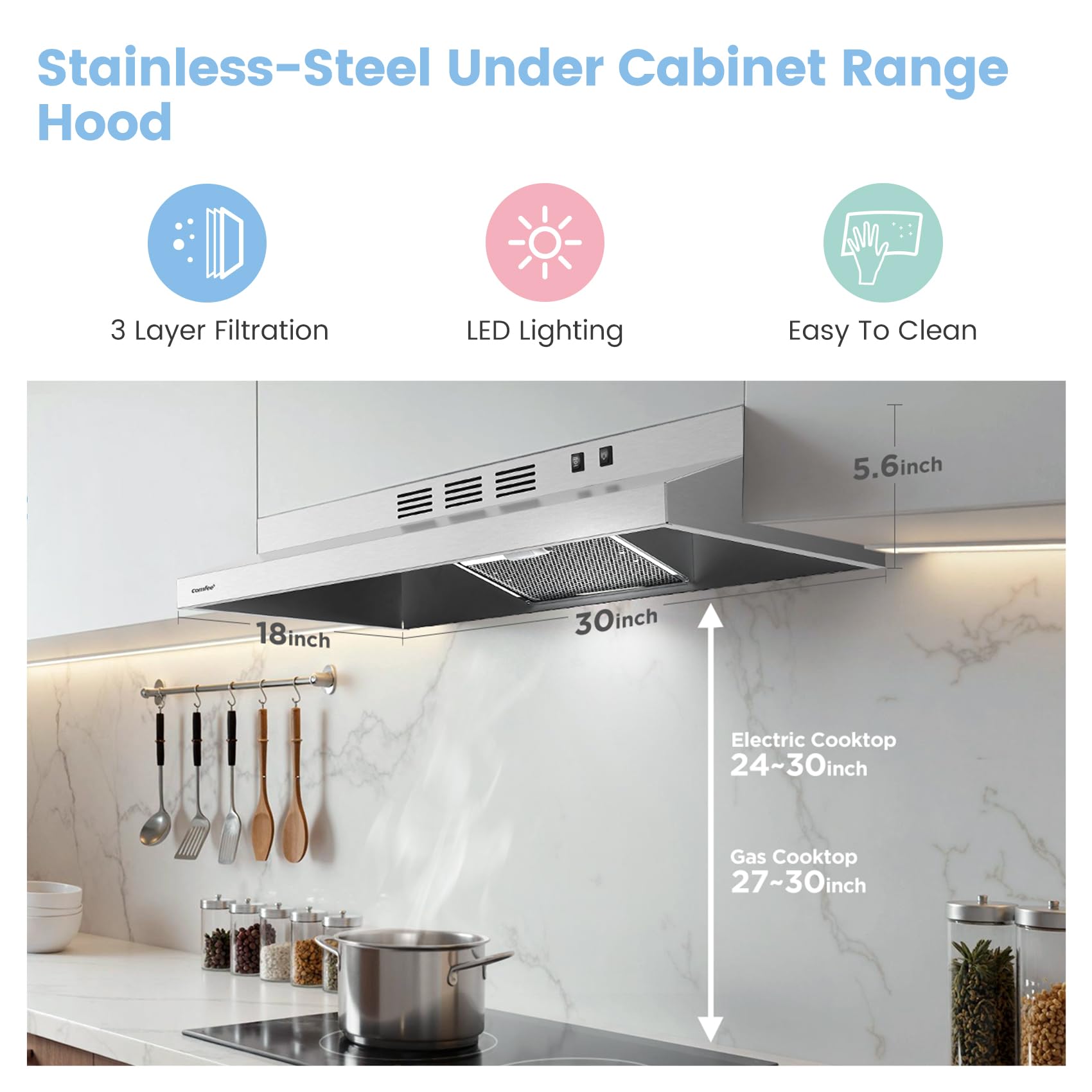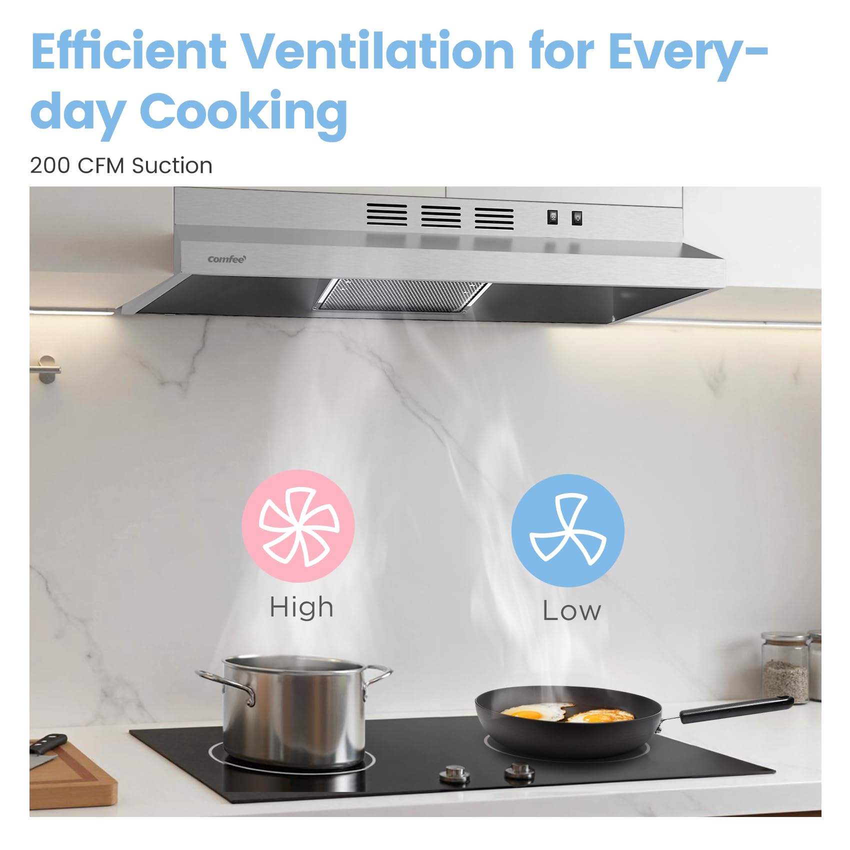 Comfee 30 Slim Wall Mount Range Hood Vent Hood, 200 CFM Area Coverage, Stainless Steel Stove Hood with 2 Speed Exhaust Fan for Kitchen, Aluminum mesh and Activated Carbon Cotton Composite Filter, Space-Saving Design, The Modern Comfee Hood is designed to complement your kitchen design, equipped with a stainless steel body and detachable aluminum Filter are easy to clean. Two-speed levels include Low and High, which are suitable for simmering soups, broiling steaks, stirfrying and more!