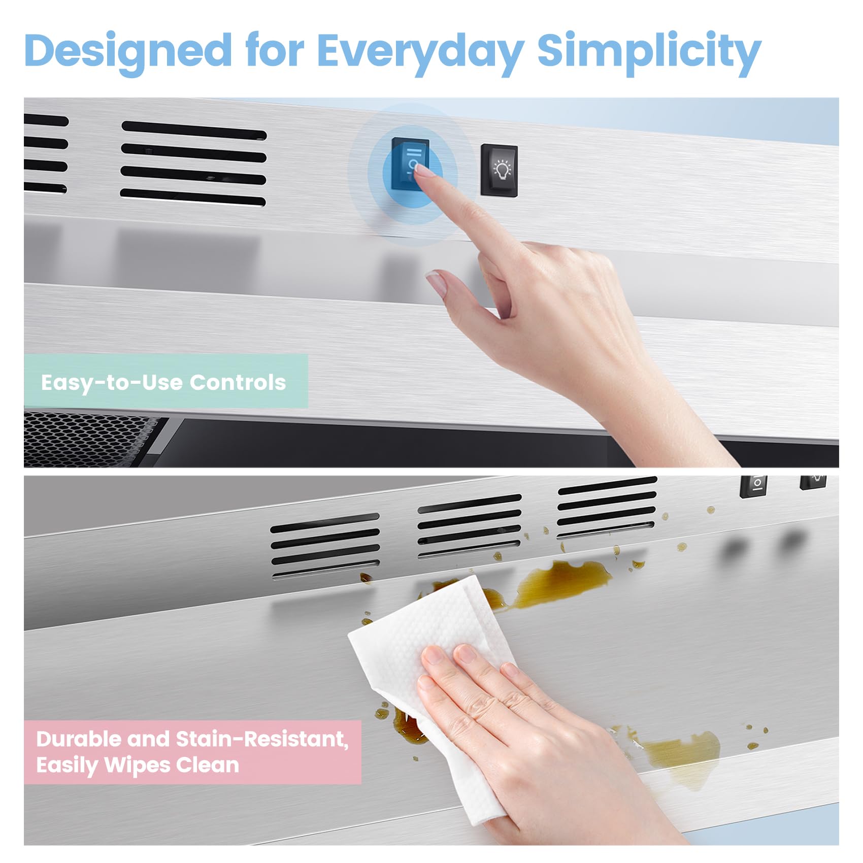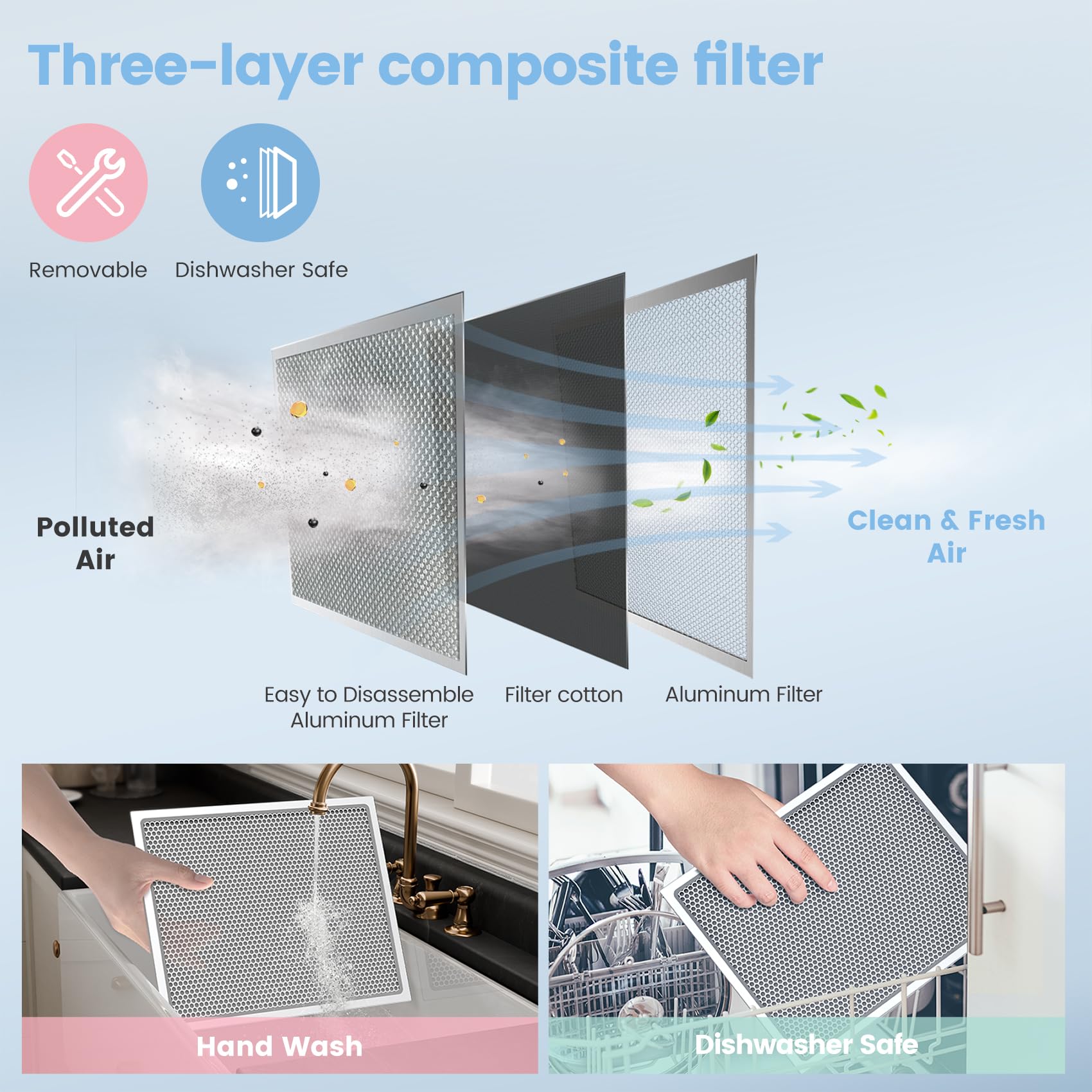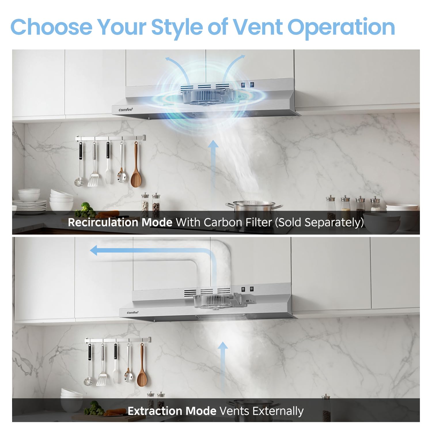 Improving Kitchen Air Quality High-quality Comfee range hood with 2-speed exhaust fan provides strong air suction to remove most of the smoke and cooking odors from the air faster while keeping the noise low.