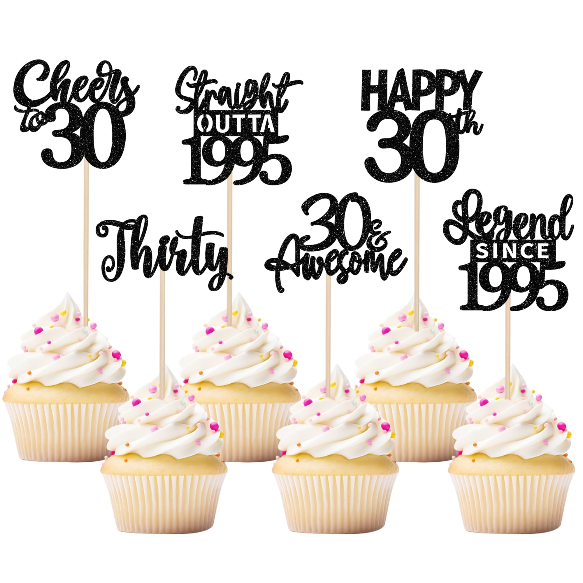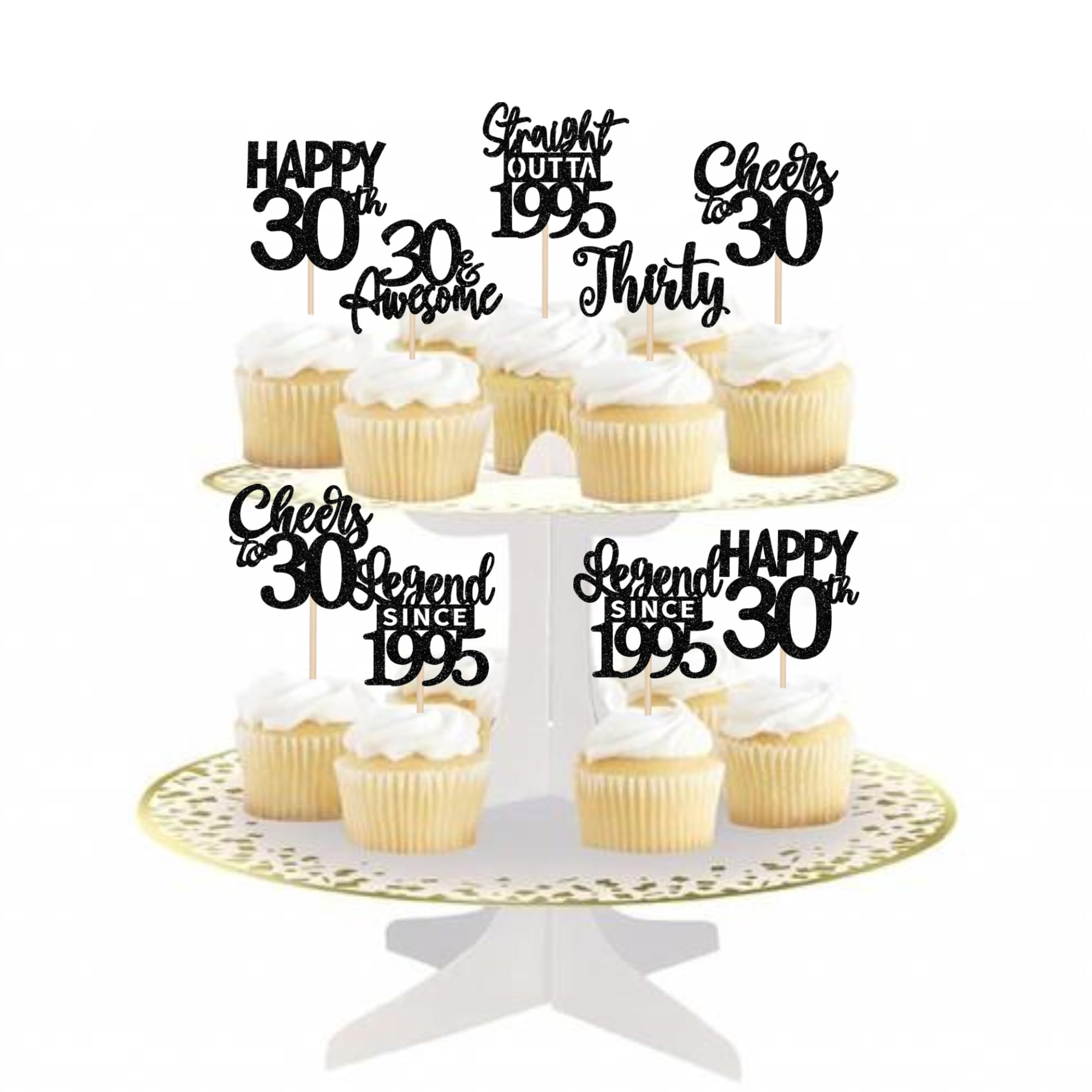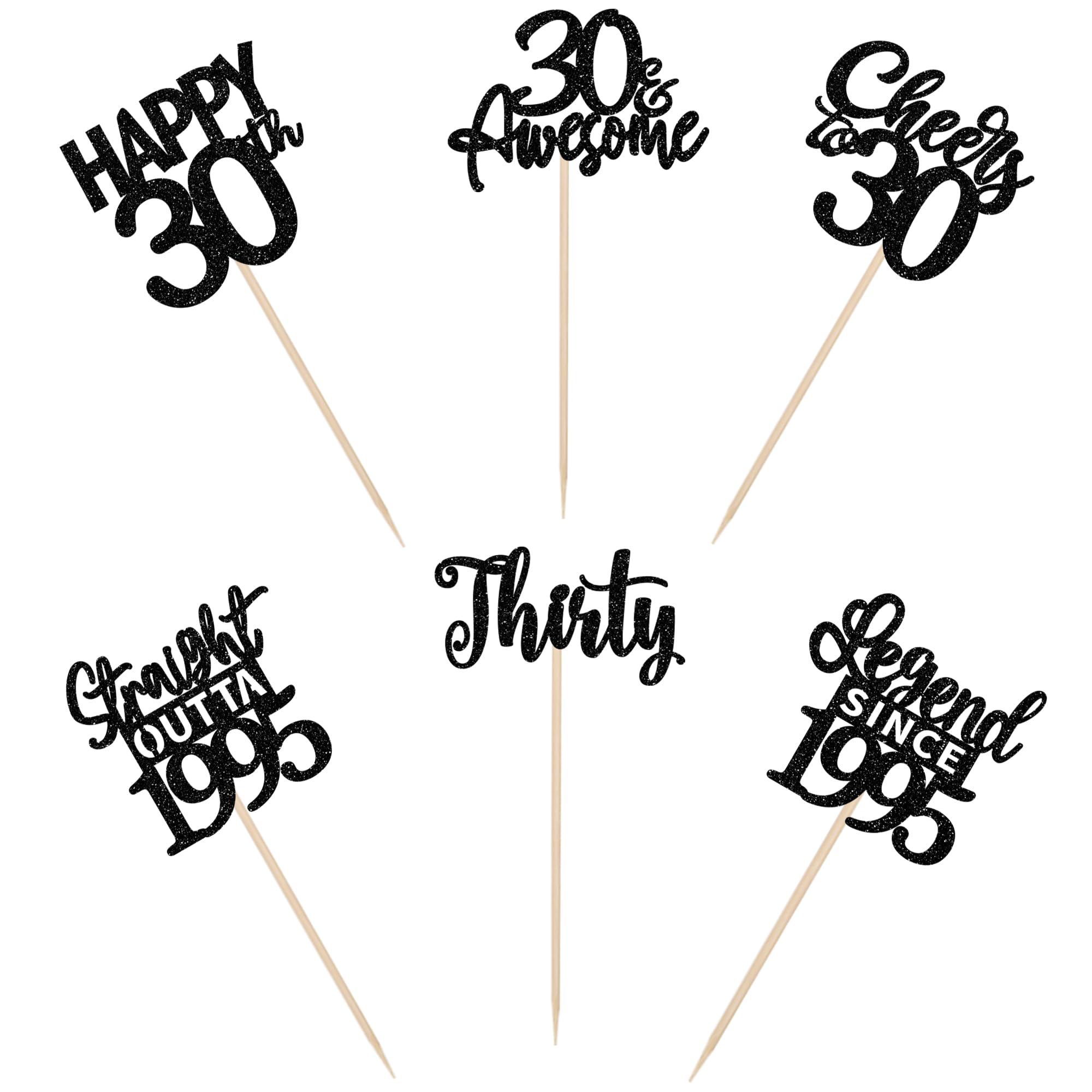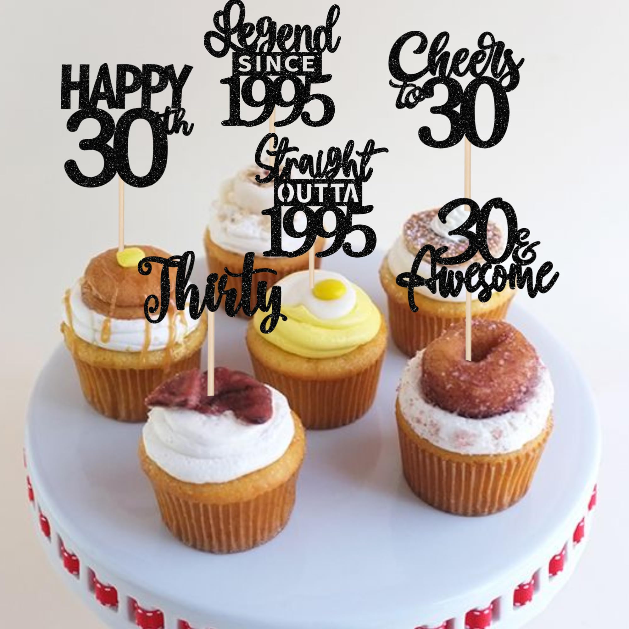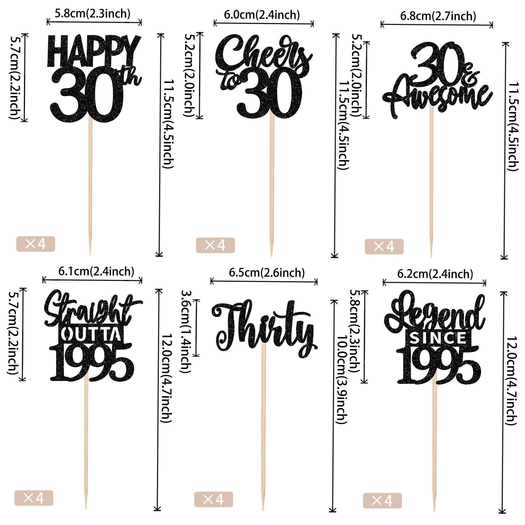 24PCS Happy 30th Birthday Cupcake Toppers Thirty Straight Outta 1995 Cupcake Picks Cheers to 30 Birthday Decorations Lengend Since 1995 Cupcake Decorations for 30th Birthday Anniversary Party Cake Decorations Supplies Perfect for legend since 1995 theme party, 30th anniversary theme party,cheers to 30 years theme party, 30 awesome theme party cupcake decorations supplies. Pack of 24 pcs,4 pcs of each design. The size is 2.3*4.5/ 2.4*4.5/ 2.7*4.5/ 2.4*4.7/ 2.6*3.9/ 2.4*4.7 inch ( with stick ) Made of high quality paper card stock,thick and sturdy. These straight outta 1995 cupcake toppers are one side glitter, another side is white, and they are intended for decoration only, please do not put them in oven or microwave. If the item you received has any defects, please contact us immediately.we will deal with it within 24 hours.