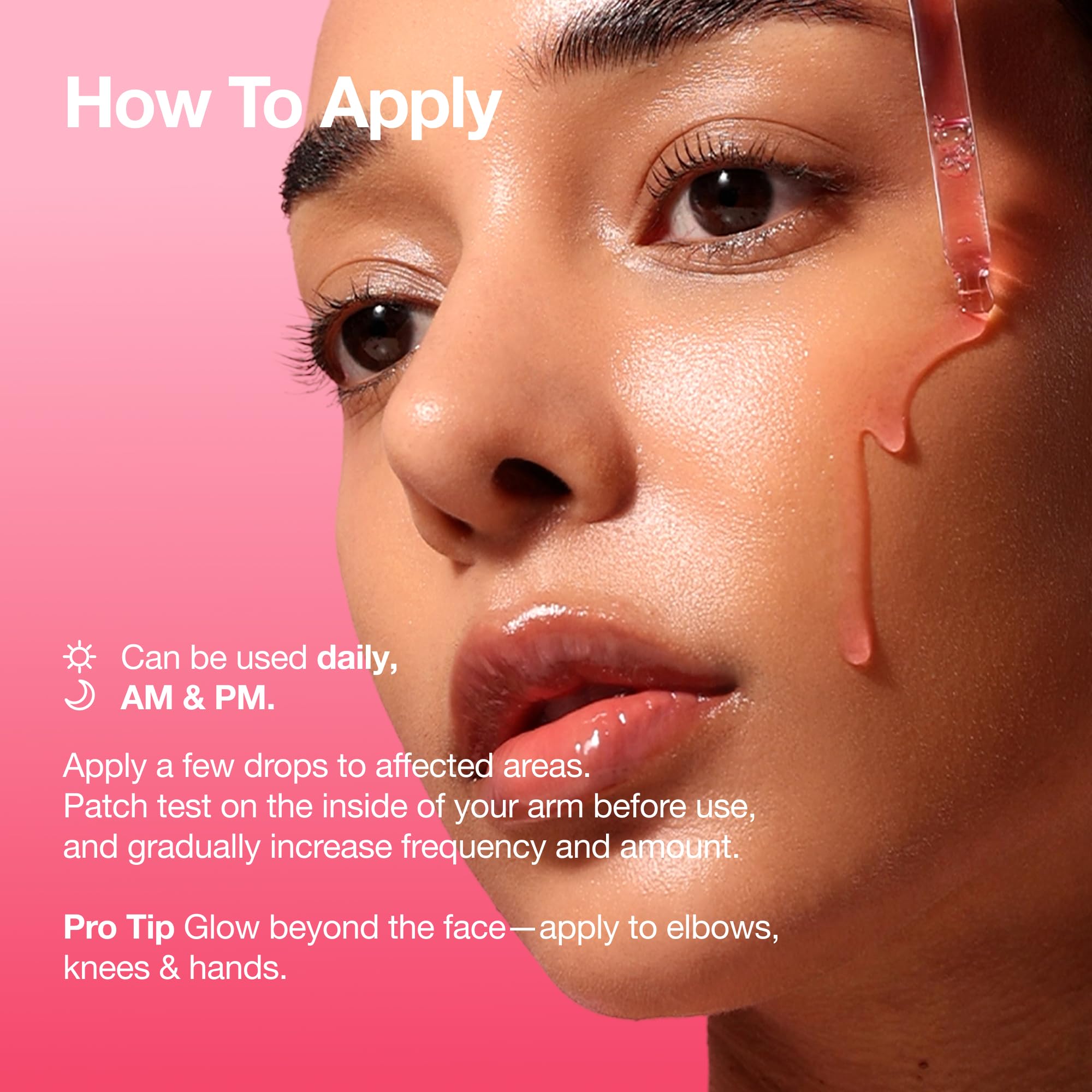 [Pro Tip] Extend your glow beyond the face to the body. Apply to rough- or dull-looking areas like elbows, knees, or hands to reveal smoother-looking skin.