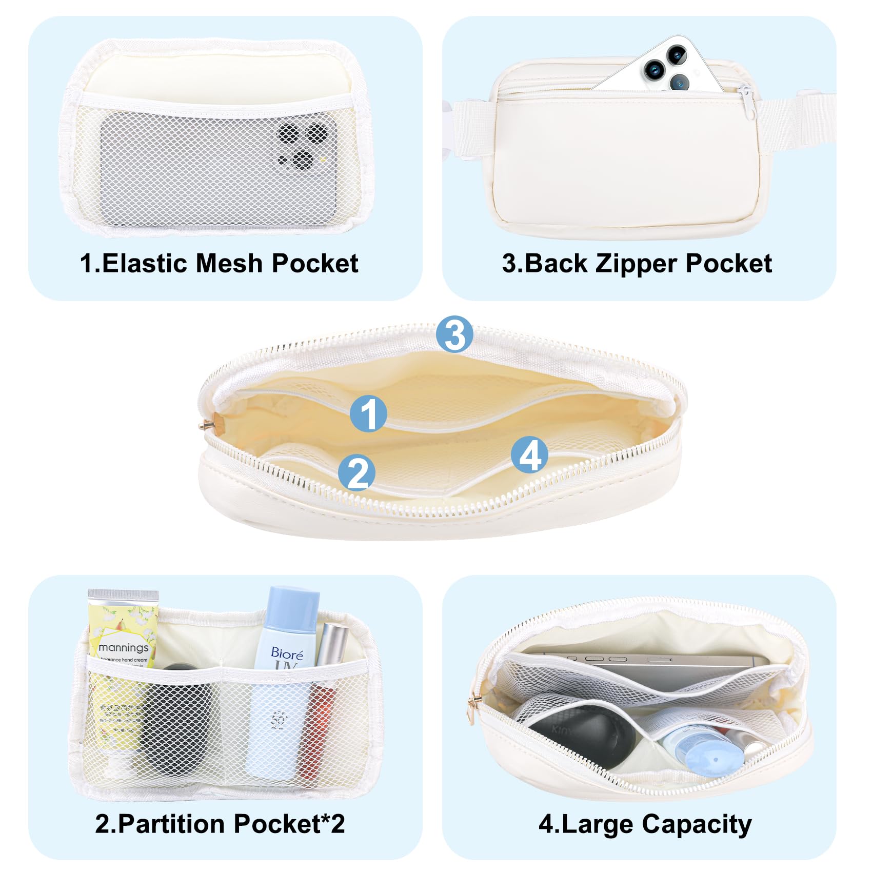 Large Capacity: The Belt packs have one main pocket + back pocket + big insert bag +insert card pocket*2. You can put your mobile phone, key, headset, headset, sunglasses, cosmetics, wallets, passports, etc.