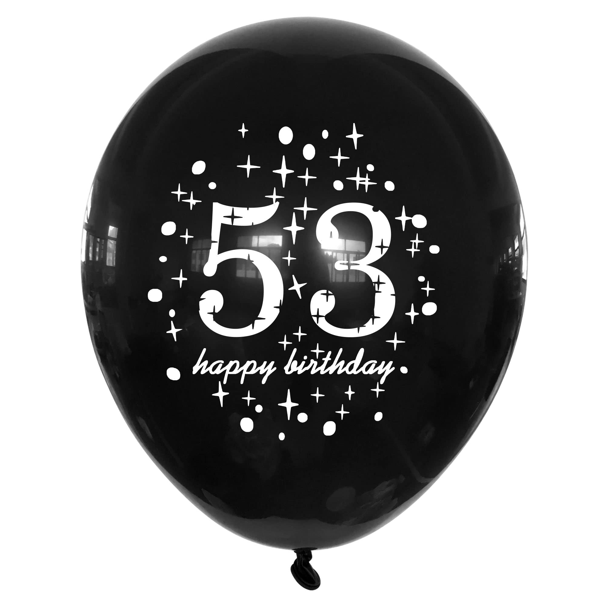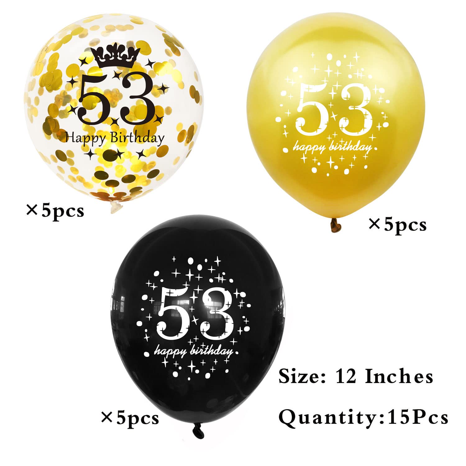 Package:5 pieces 12 inch black latex balloon printed with the words "53 Happy Birthday",5 pieces 12 inch gold latex balloon printed with the words"53 Happy Birthday",5 piece 12 inch gold confetti balloons printed with the words"53 Happy Birthday",very suitable for women men 53rd birthday party decorations