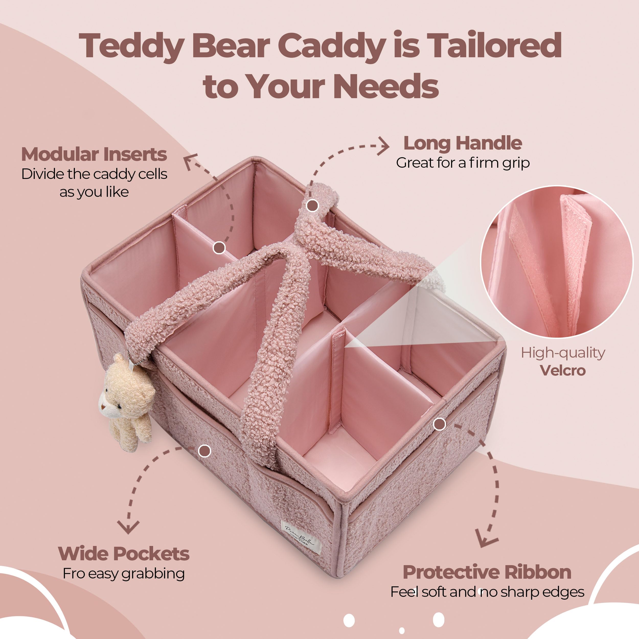 BONUS TEDDY BEAR CHARM AND LUXURIOUS PLUSH SHERPA EXTERIOR : Crafted with a premium plush sherpa exterior, our Baby Diaper Caddy feels as cozy as it looks. Each caddy comes with an adorable teddy bear charm, adding a touch of delight. It's a small detail that makes a big impression, perfect for gifting