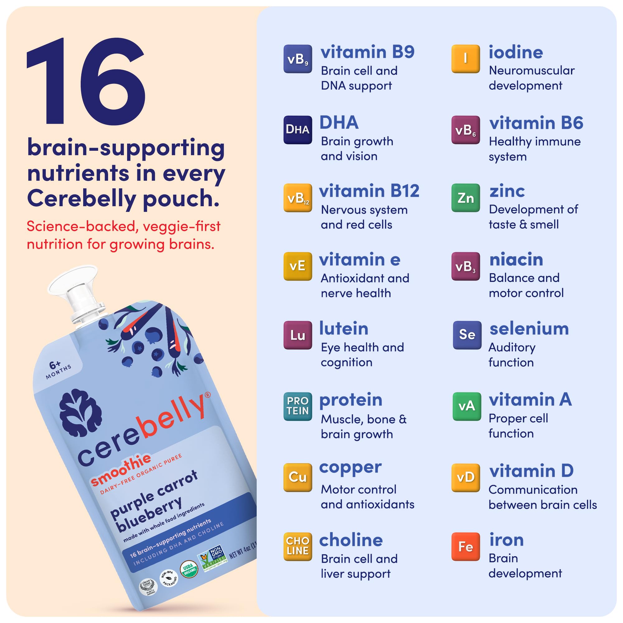 16 BRAIN-SUPPORTING NUTRIENTS – Baby smoothie pouches with vitamin A, iron & vitamin D to fuel healthy brain and body development