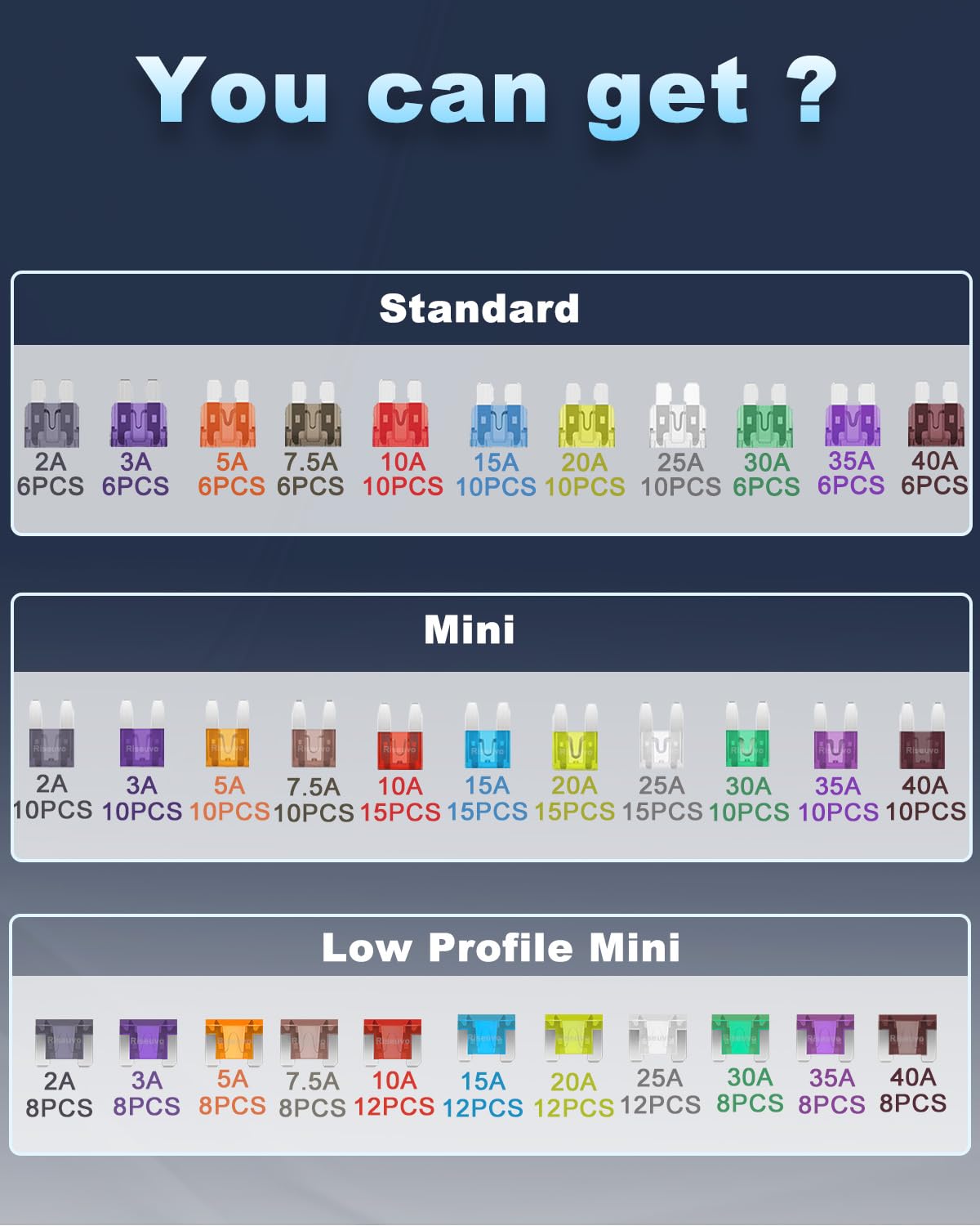 A Universal 3-in-1 Fuse Solution - End fuse confusion with a single comprehensive kit. This 316-piece master set combines Standard, MINI, and Low-Profile blade fuses for most cars, trucks, SUVs, RVs, and boats from the 1990s to the latest models.