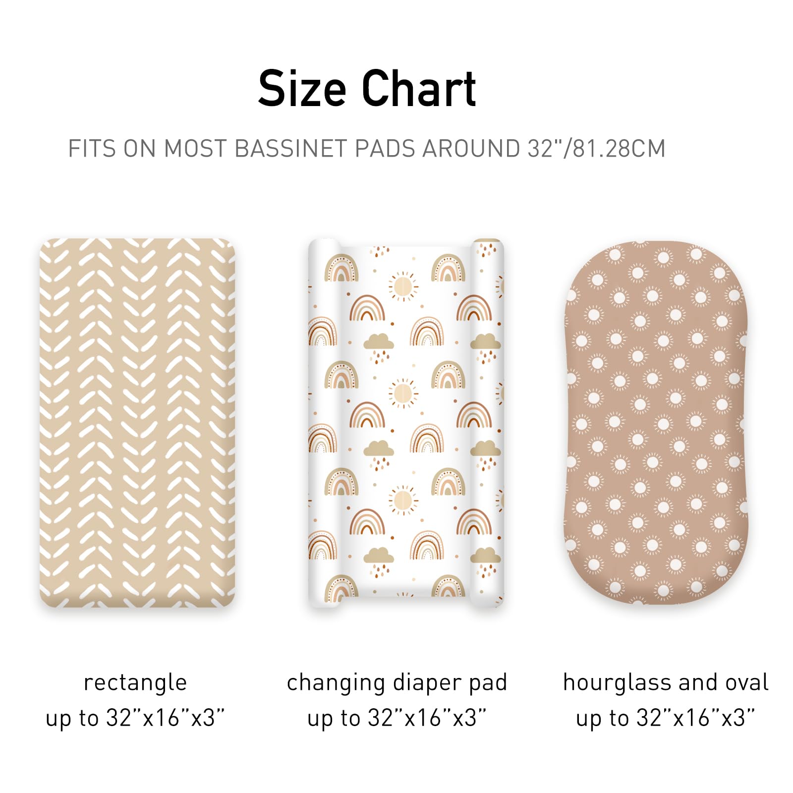 3-Pack Bassinet Fitted Sheets: Our Organic Bassinet Mattress Sheets (32"x16", up to 3" depth) offer universal fit for all bassinet mattress typesβcompatible with hourglass, oval, square, and rectangle designs.