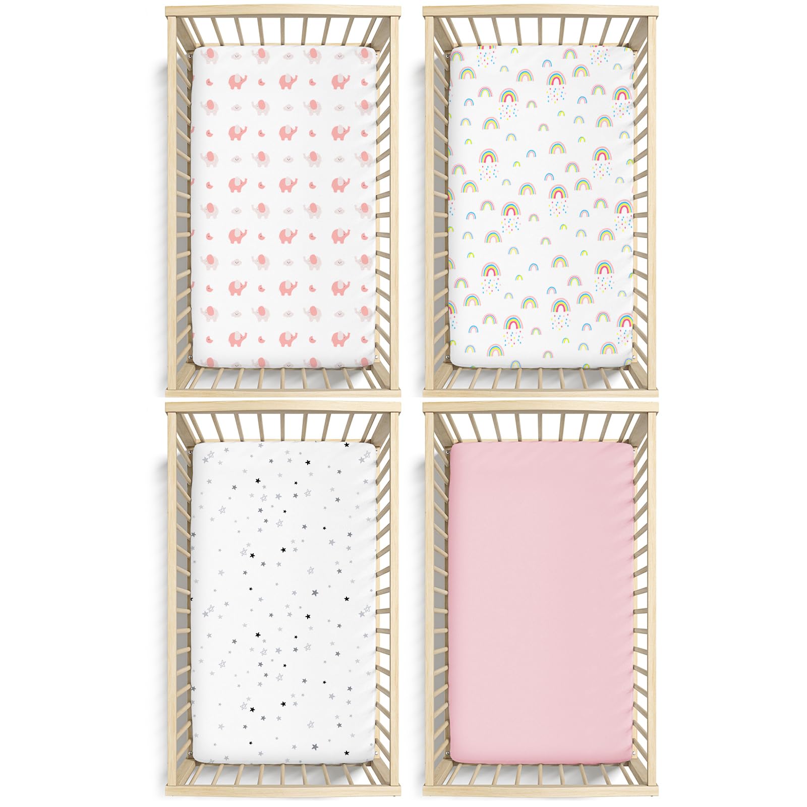 Bright Pattern:Including colorful rainbow,pink elephants, stars patterns and pink 4-piece, these crib sheets girl are vibrant, cute and perfect for a little girl,which makes such an adorable addition to her nursery