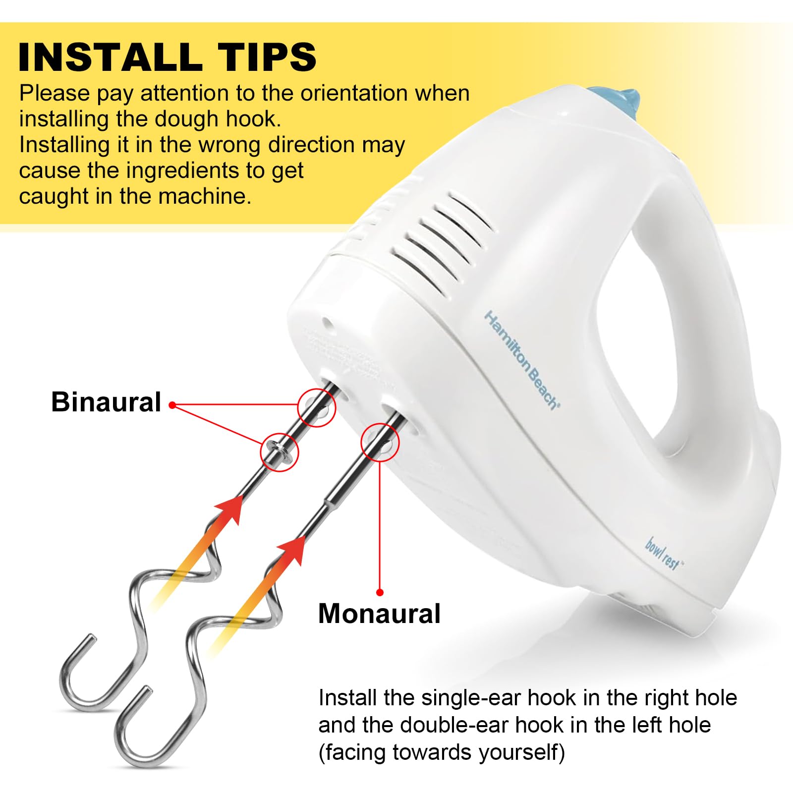 [INSTALL TIPS]: Please pay attention to the orientation when installing the dough hook. Install the single-ear hook in the right hole and the double-ear hook in the left hole (facing towards yourself). Installing it in the wrong direction may cause the ingredients to get caught in the machine.