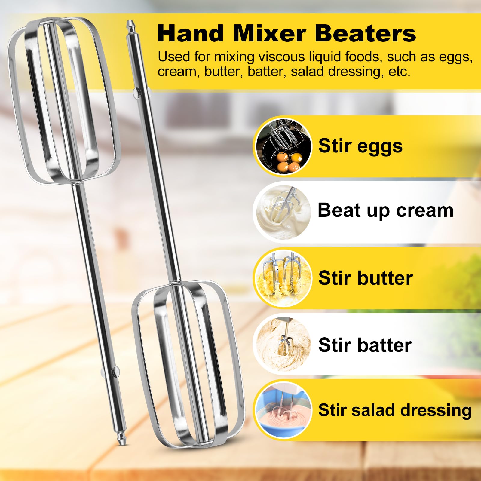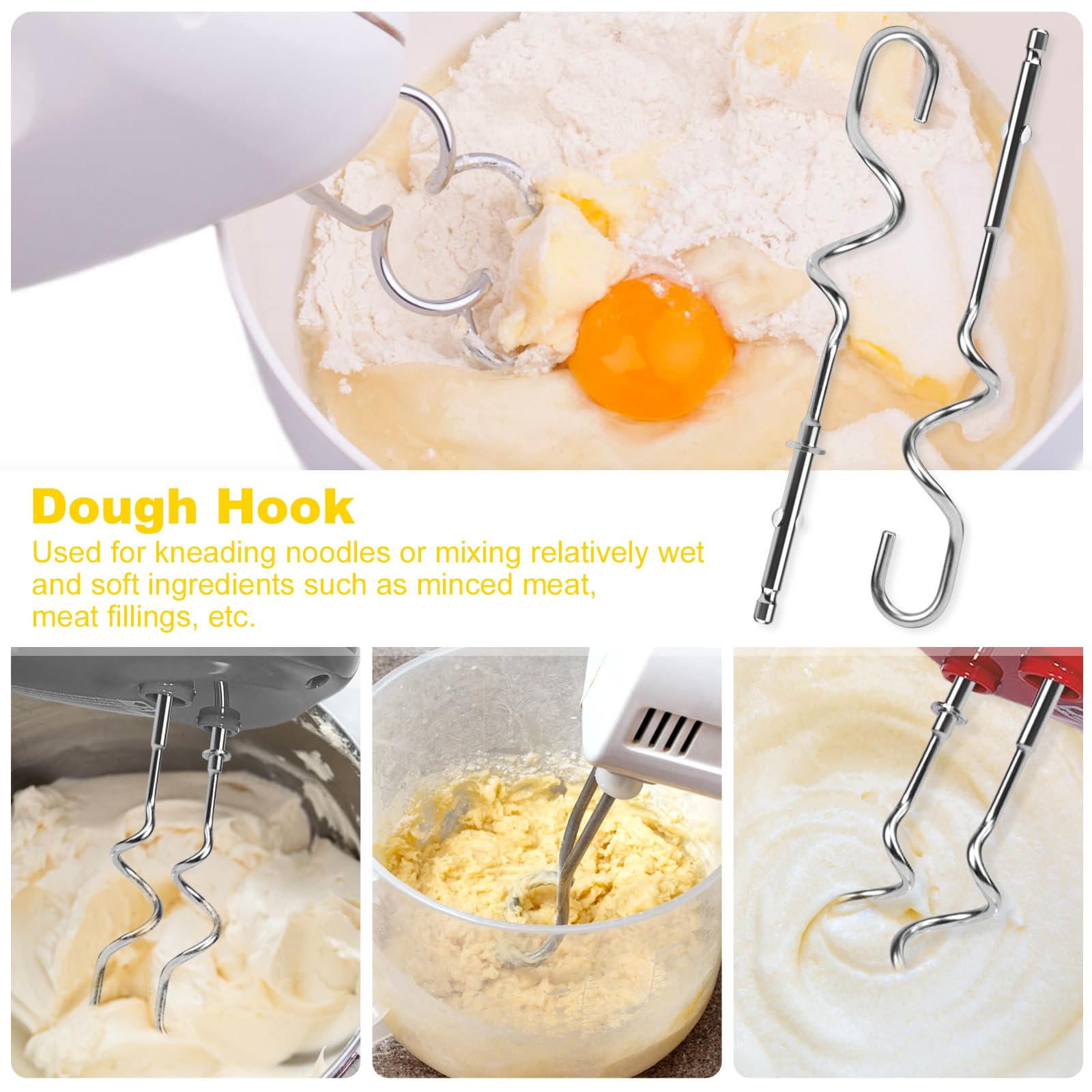 [WIDE USAGE]: The hand mixer beaters is used for mixing viscous liquid foods, such as eggs, cream, butter, batter, salad dressing, etc. The dough hook is used for kneading noodles or mixing relatively wet and soft ingredients such as minced meat, meat fillings, etc.