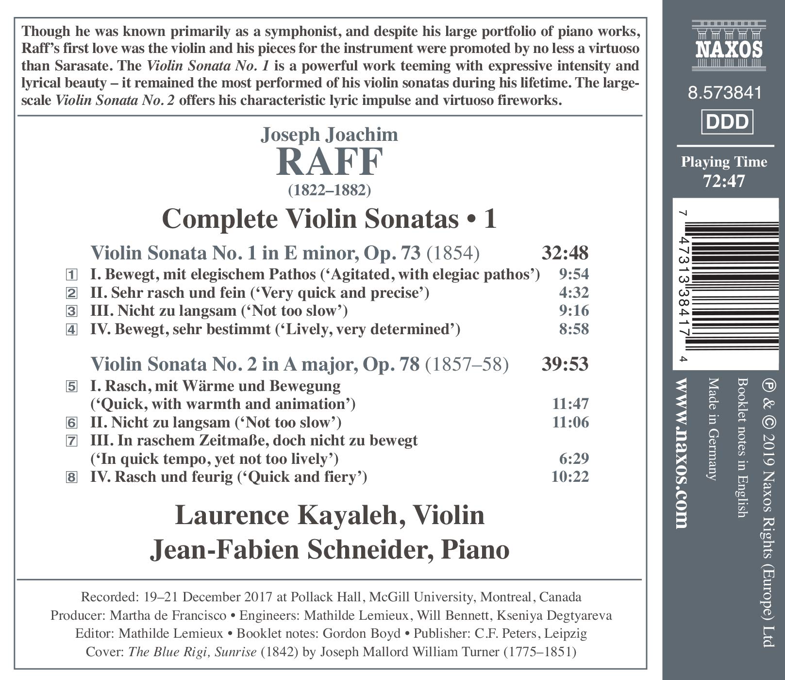 Though he was known primarily as a symphonist, and despite his large portfolio of piano works, Raff's first love was the violin and his pieces for the instrument were promoted by no less a virtuoso than Sarasate, The Violin Sonata No. 1 is a powerful work teeming with expressive intensity and lyrical beauty- it remained the most performed of his violin sonatas during his lifetime. The large-scale Violin Sonata No. 2 offers his characteristic lyric impulse and virtuoso fireworks. Laurence Kayaleh has performed as a guest soloist with many distinguished orchestras, including the Tonhalle Orchester Zurich, the Russian National Orchestra, the National Symphony Orchestra, and many others. She has recorded the complete works for violin and piano by Medtner, Honegger and Catoire for Naxos. She plays a 1742 Guarneri which belonged to the eminent violinist and pedagogue Carl Flesch.