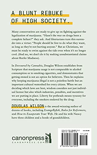 A blunt rebuke of high society. Many conservatives are ready to give up on fighting against the legalization of marijuana. “Hasn’t the war on drugs been a complete failure?” they ask. And libertarians turn this surrender into a virtue: “People should be free to do what they want, as long as they’re not hurting anyone.” But as Christians, we must be ready to swim against the tide even when it’s no longer cool. (And no, we don’t do it by making unsubstantiated claims about Reefer Madness). In Devoured by Cannabis, Douglas Wilson establishes from Scripture that marijuana usage is not comparable to alcohol consumption or to smoking cigarettes, and demonstrates that getting stoned is not an option for believers. Then he explains why keeping marijuana illegal is not a pointless battle but an important cultural watershed for every citizen. When we are deciding which laws are best, wisdom considers not just individual license but also which industries, penalties, and incentives we are putting in place. Liberty for potheads means tyranny for everyone, including the smokers enslaved by the drug.