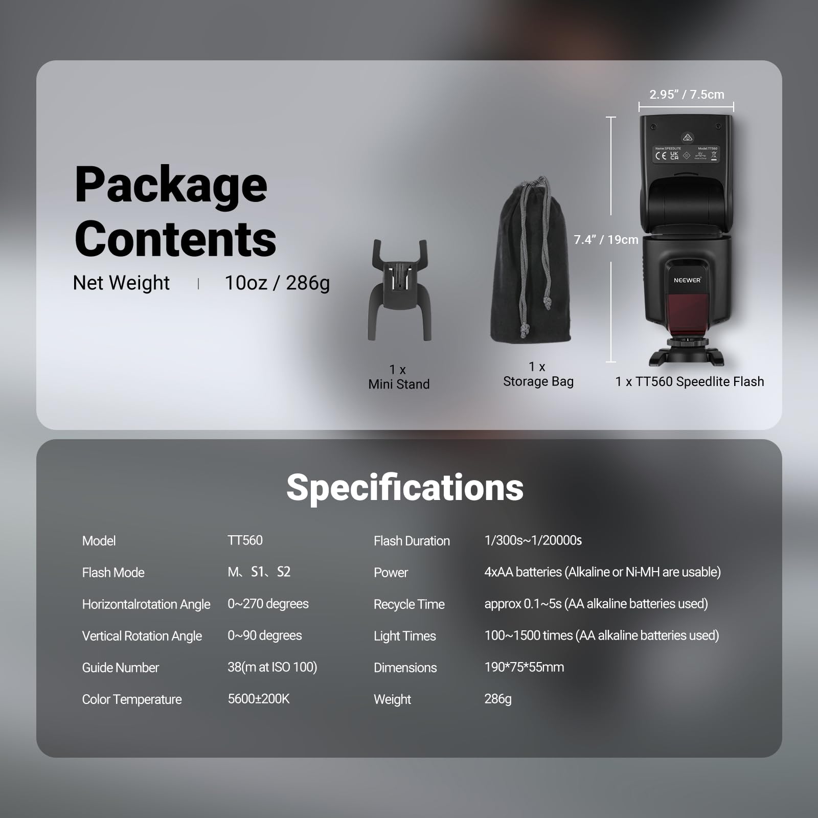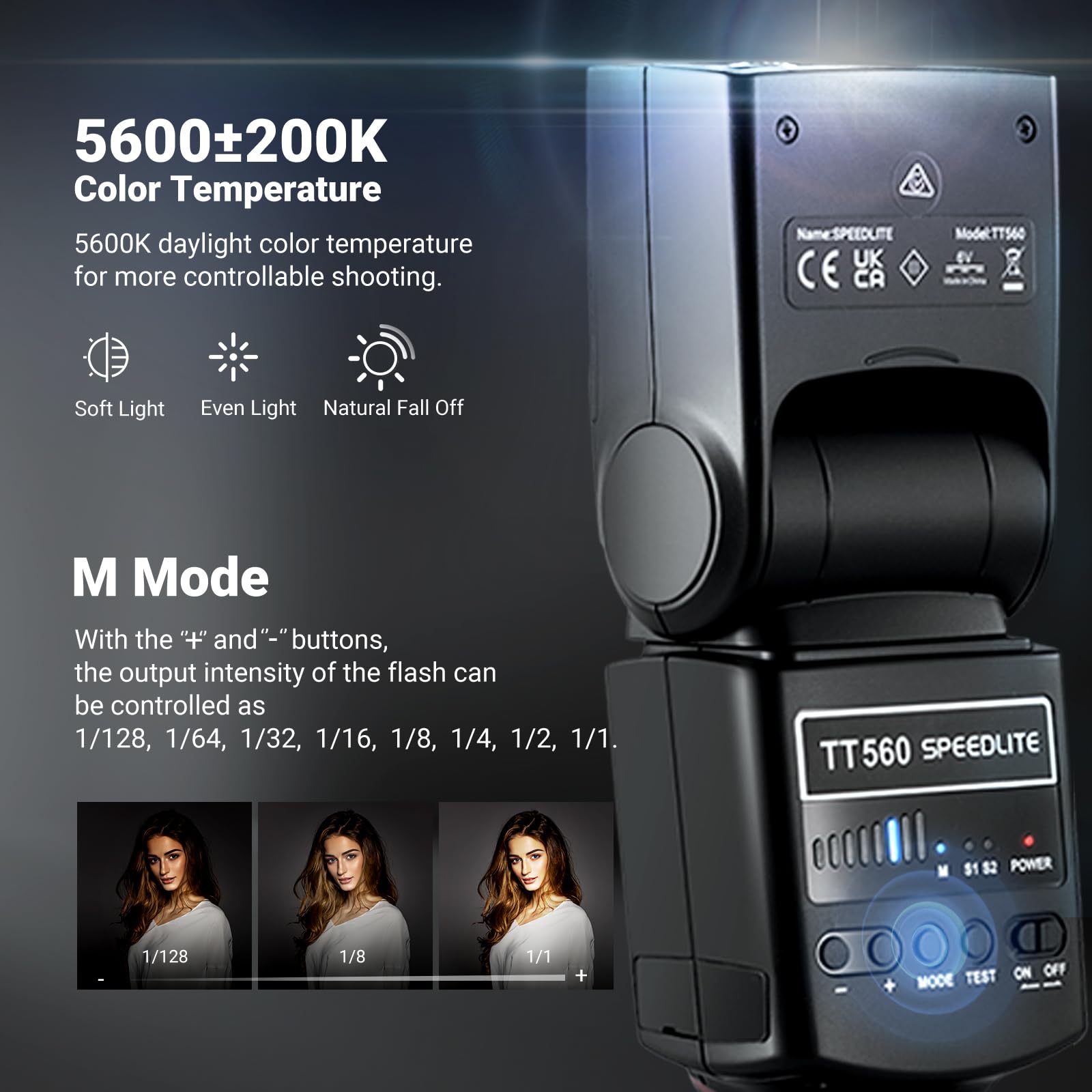 【Professional Flash Output for Stable Lighting】 TT560 speed light features GN38 (ISO 100) guide number with 8 manual power levels from 1/128 to 1/1, stable 5600K±200K daylight color, 0.1–5s recycle time, and 1/300 to 1/20000s flash duration. Note: Does NOT support TTL, HSS, or camera menu control. Recommended shutter speed below 1/200s