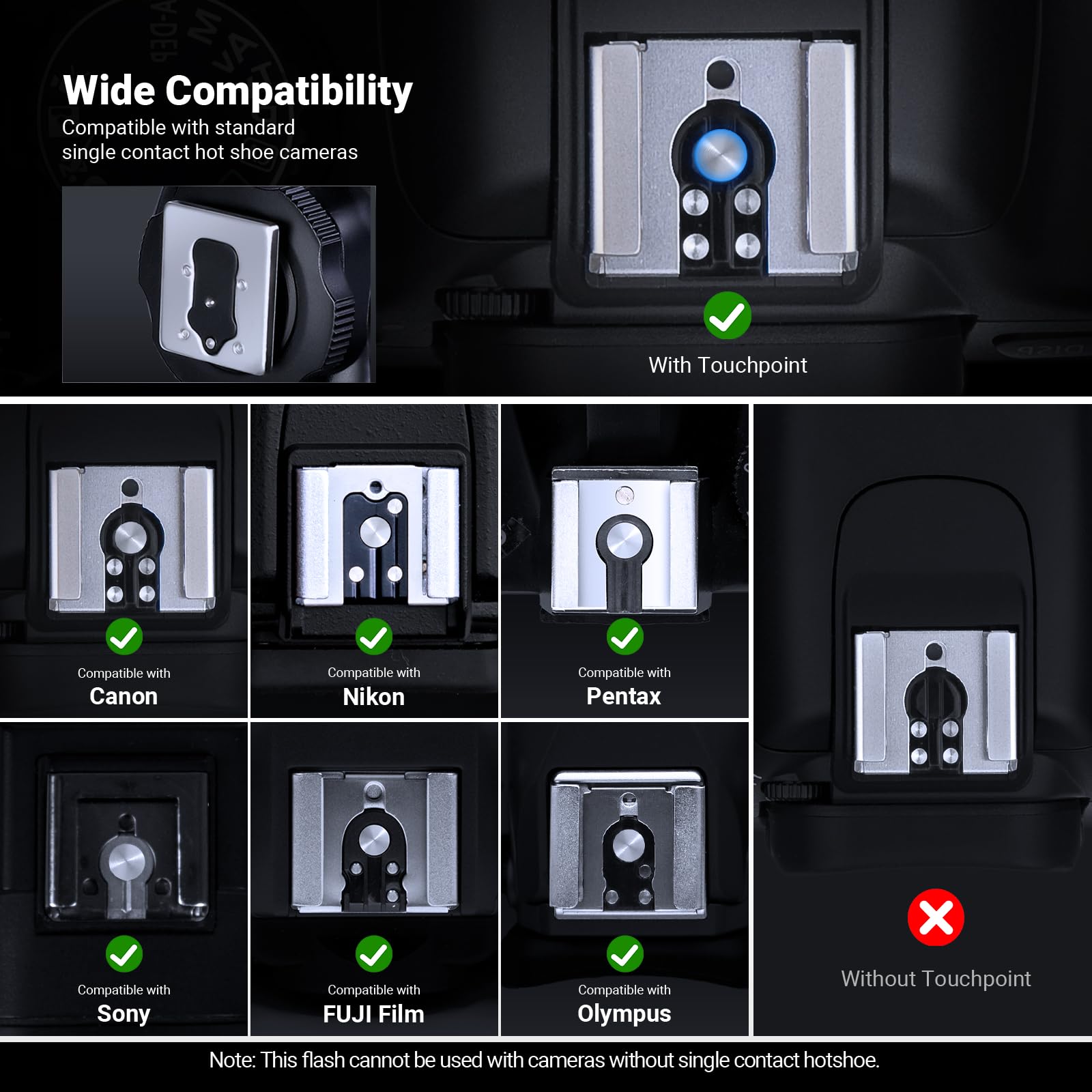 【Wide Compatibility】 The flash attachment as photography accessories is compatible with Canon Nikon Panasonic Olympus Pentax Fujifilm standard hot shoe cams and Sony MI hot shoe models A9 A7III A7IV A7RIV A6400 ZV-1 A6000 A6300 A6500. Not compatible with Canon SL3 250D T7 1500D 2000D T100 3000D 4000D R6 200DII R50 Sony A9III A99 A77 A350 ZV-1F ZV1 Mark 2 Fujifilm X-A3X 100F X100T. Note: This flash cannot be used with cameras without single contact hotshoe. Disable electrical shutter during use
