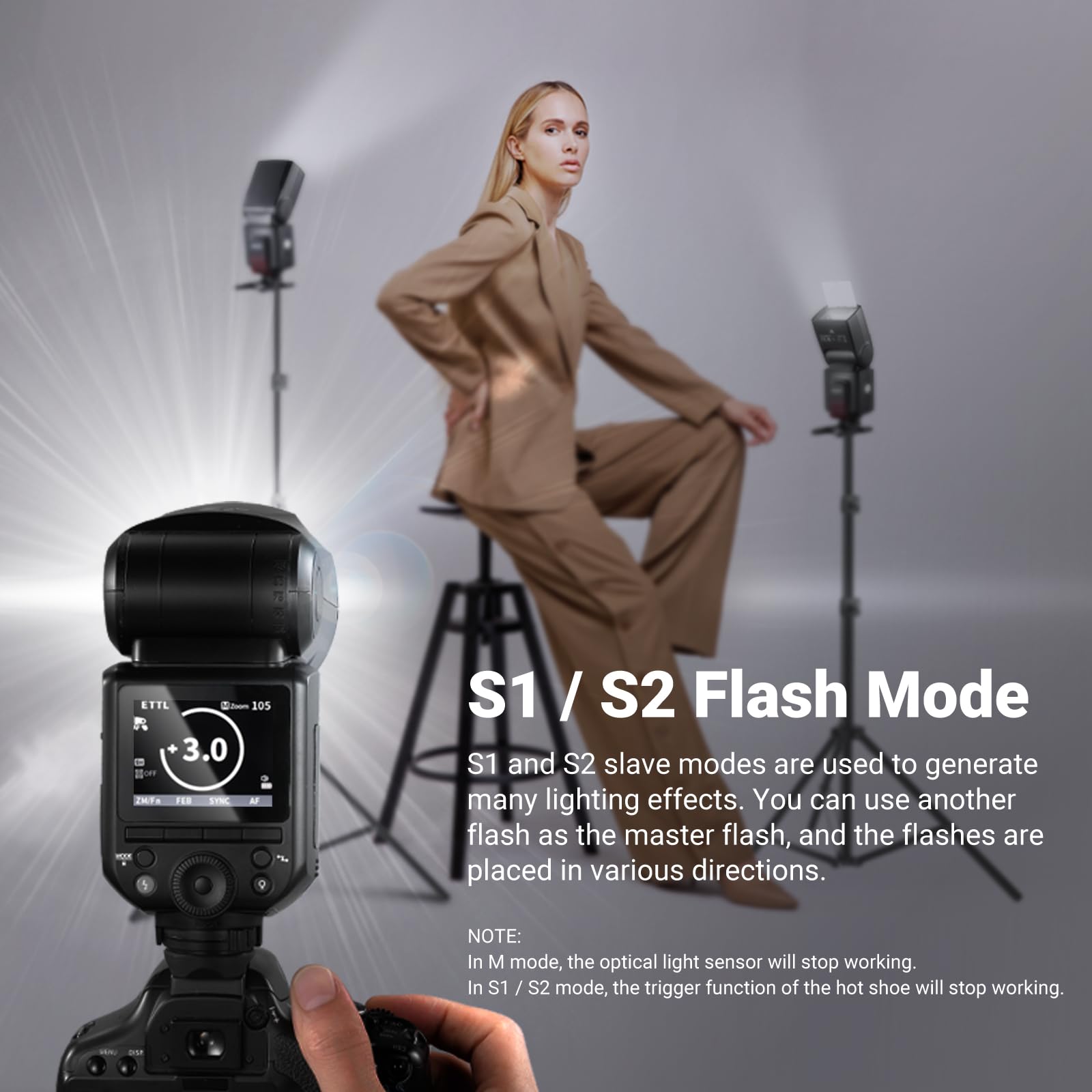 【Optical Slave & Off Camera Triggering】 Supports S1/S2 optical modes for off camera use as a secondary flash to create various lighting effects. S1 works with the main flash in manual mode, while S2 works with the main flash in TTL mode. Equipped with a PC sync port for triggering the flash and camera via a sync cable